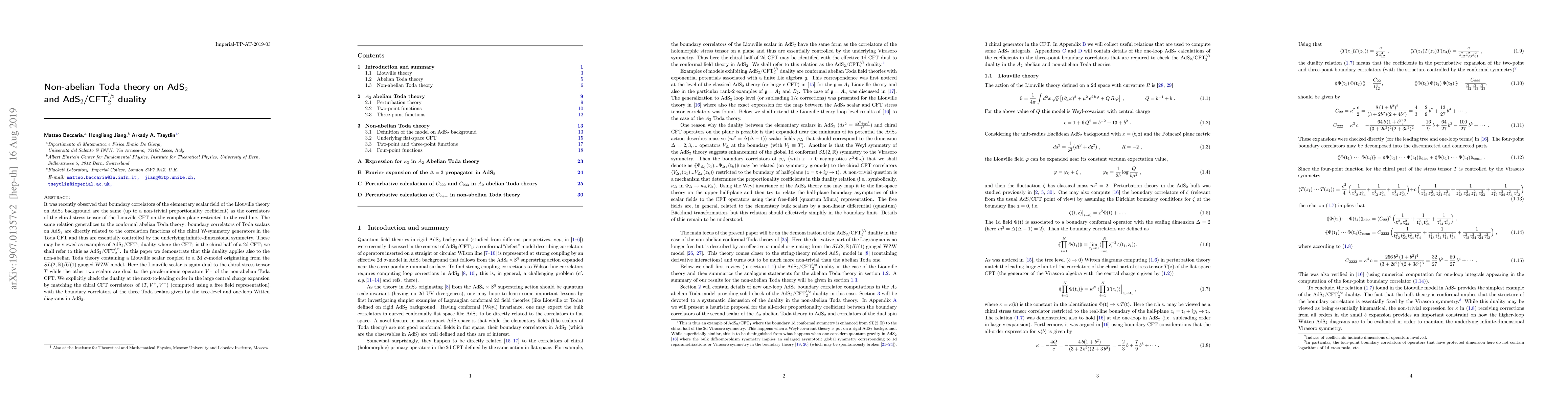 This paper explores the AdS$_2$/CFT$_{1/2}^2$ duality in non-abelian Toda theory, showing that boundary correlators of Toda scalars on AdS$_2$ are related to the correlation functions of chiral $\mathcal W$-symmetry generators in the corresponding Toda CFT. The authors verify this duality at next-to-leading order by matching CFT correlators with AdS$_2$ boundary correlators derived from Witten diagrams.
