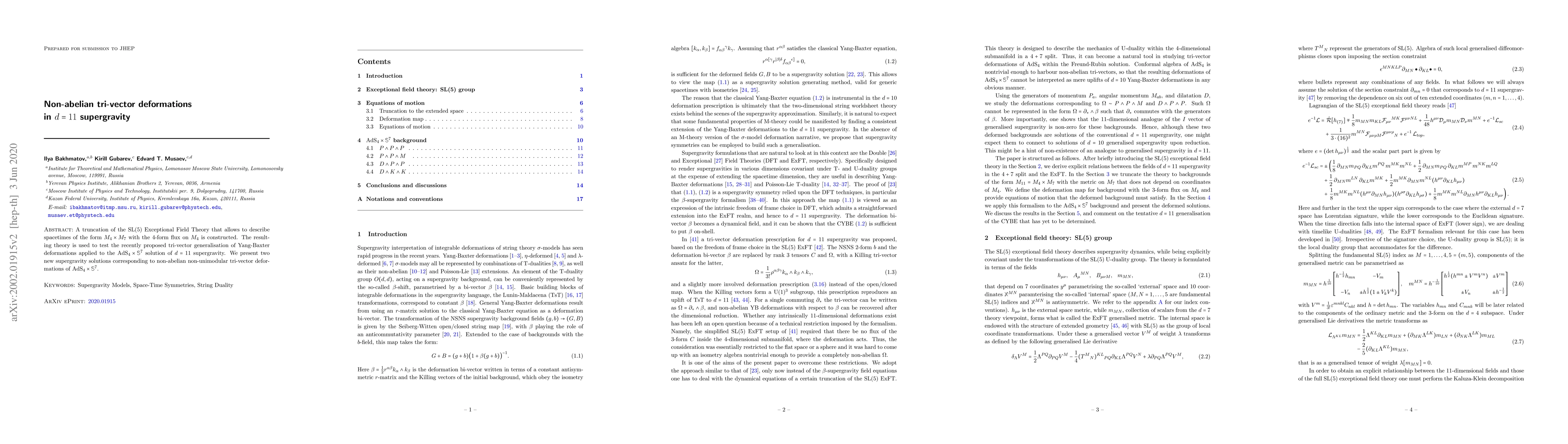 A truncation of the SL(5) Exceptional Field Theory that allows to describe spacetimes of the form $M_4 \times M_7$ with the 4-form flux on $M_4$ is constructed. The resulting theory is used to test the recently proposed tri-vector generalisation of Yang-Baxter deformations applied to the AdS${}_4 \times \mathbb{S}^7$ solution in $d=11$ supergravity. We present two new supergravity solutions corresponding to non-abelian non-unimodular tri-vector deformations of AdS${}_4 \times \mathbb{S}^7$.