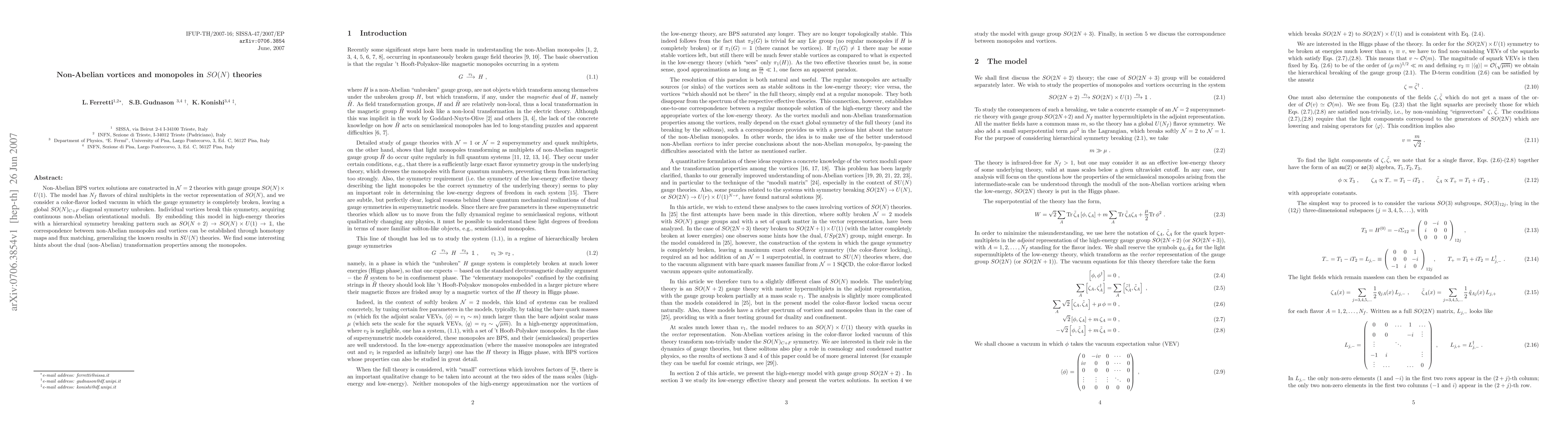 This paper constructs non-Abelian BPS vortex solutions in N=2 SO(N) gauge theories with chiral multiplets, revealing their orientational moduli. It establishes a correspondence between non-Abelian monopoles and vortices in a hierarchical symmetry breaking pattern, offering insights into dual transformation properties.