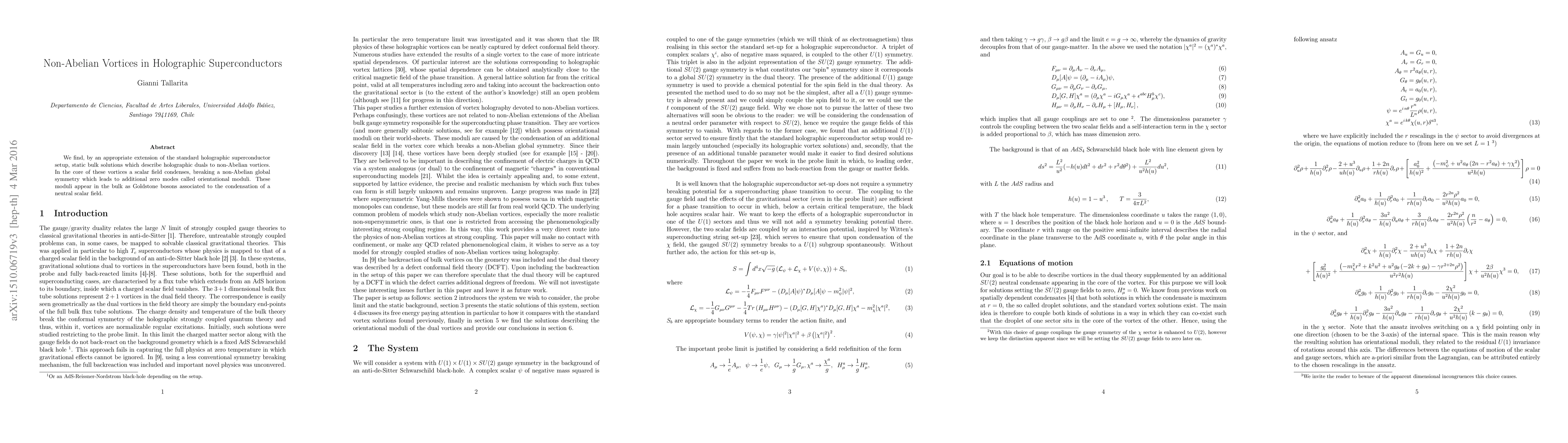 This paper extends the holographic superconductor model to find static bulk solutions representing non-Abelian vortices, where a scalar field condenses in the vortex core, breaking a non-Abelian global symmetry and introducing additional zero modes known as orientational moduli, which manifest as Goldstone bosons in the bulk.