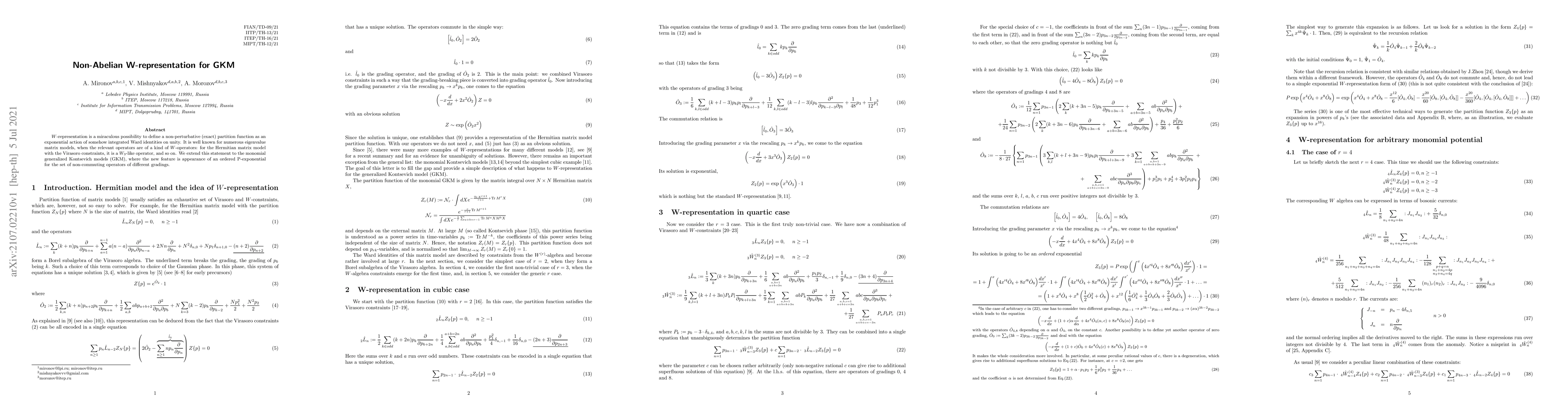 $W$-representation is a miraculous possibility to define a non-perturbative (exact) partition function as an exponential action of somehow integrated Ward identities on unity. It is well known for numerous eigenvalue matrix models when the relevant operators are of a kind of $W$-operators: for the Hermitian matrix model with the Virasoro constraints, it is a $W_3$-like operator, and so on. We extend this statement to the monomial generalized Kontsevich models (GKM), where the new feature is the appearance of an ordered P-exponential for the set of non-commuting operators of different gradings.