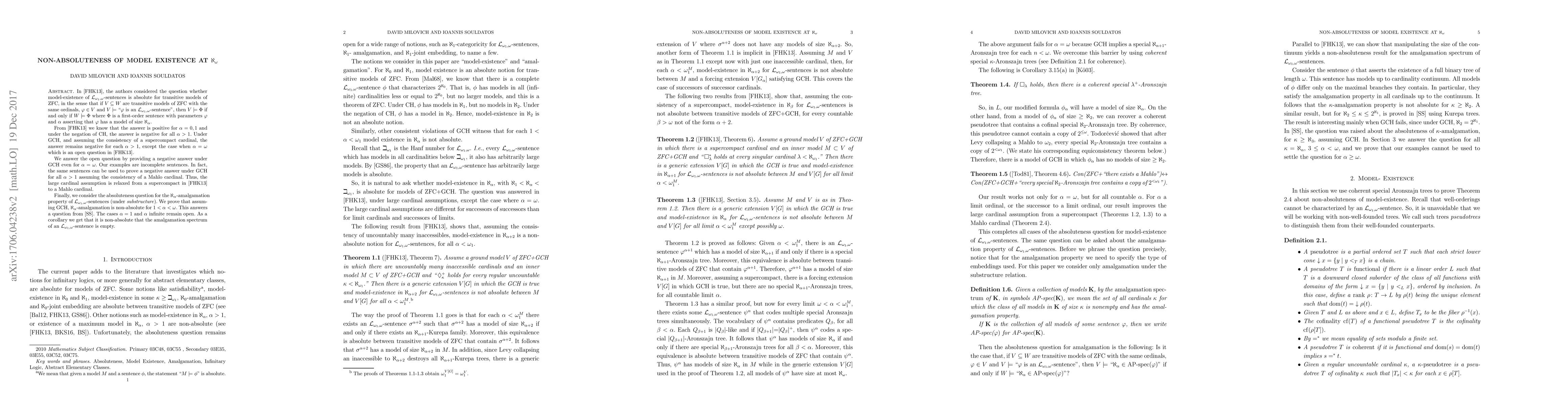 In [FHK13], the authors considered the question whether model-existence of $L_{\omega_1,\omega}$-sentences is absolute for transitive models of ZFC, in the sense that if $V \subseteq W$ are transitive models of ZFC with the same ordinals, $\varphi\in V$ and $V\models "\varphi \text{ is an } L_{\omega_1,\omega}\text{-sentence}"$, then $V \models "\varphi \text{ has a model of size } \aleph_\alpha"$ if and only if $W \models "\varphi \text{ has a model of size } \aleph_\alpha"$. From [FHK13] we know that the answer is positive for $\alpha=0,1$ and under the negation of CH, the answer is negative for all $\alpha>1$. Under GCH, and assuming the consistency of a supercompact cardinal, the answer remains negative for each $\alpha>1$, except the case when $\alpha=\omega$ which is an open question in [FHK13]. We answer the open question by providing a negative answer under GCH even for $\alpha=\omega$. Our examples are incomplete sentences. In fact, the same sentences can be used to prove a negative answer under GCH for all $\alpha>1$ assuming the consistency of a Mahlo cardinal. Thus, the large cardinal assumption is relaxed from a supercompact in [FHK13] to a Mahlo cardinal. Finally, we consider the absoluteness question for the $\aleph_\alpha$-amalgamation property of $L_{\omega_1,\omega}$-sentences (under substructure). We prove that assuming GCH, $\aleph_\alpha$-amalgamation is non-absolute for $1<\alpha<\omega$. This answers a question from [SS]. The cases $\alpha=1$ and $\alpha$ infinite remain open. As a corollary we get that it is non-absolute that the amalgamation spectrum of an $L_{\omega_1,\omega}$-sentence is empty.