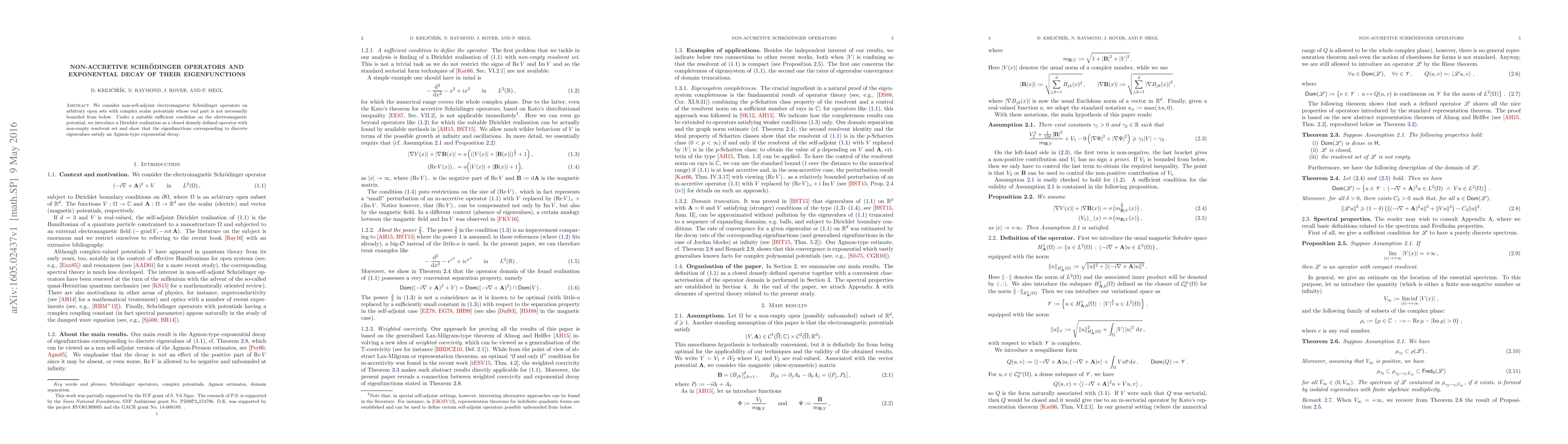 Summary: This paper explores non-self-adjoint electromagnetic Schrödinger operators with complex scalar potentials, proving that under specific conditions, the eigenfunctions exhibit Agmon-type exponential decay. A Dirichlet realization is introduced to establish the operator's properties.