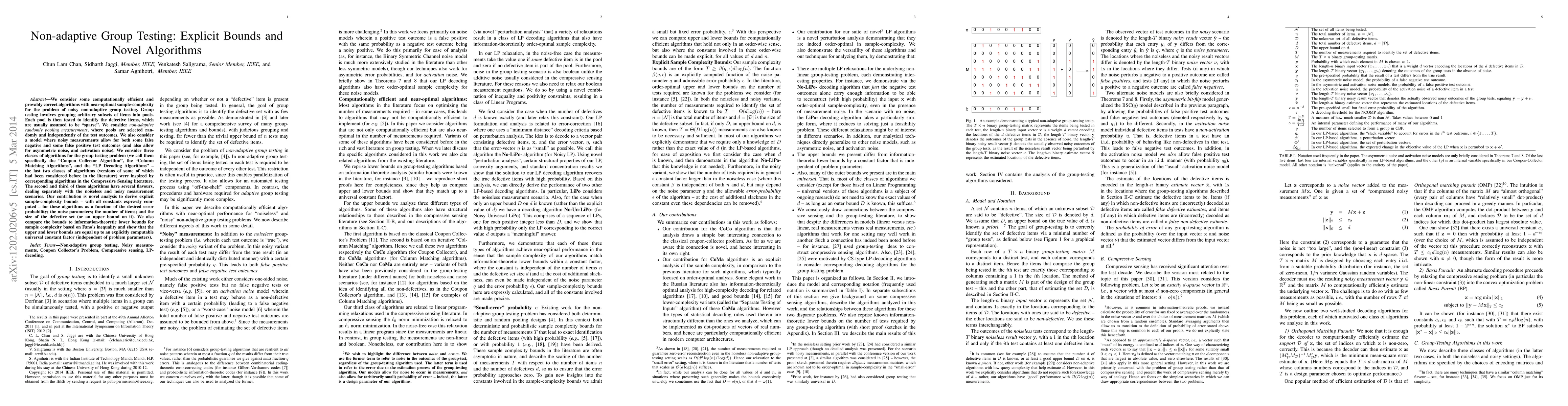 We consider some computationally efficient and provably correct algorithms with near-optimal sample-complexity for the problem of noisy non-adaptive group testing. Group testing involves grouping arbitrary subsets of items into pools. Each pool is then tested to identify the defective items, which are usually assumed to be "sparse". We consider non-adaptive randomly pooling measurements, where pools are selected randomly and independently of the test outcomes. We also consider a model where noisy measurements allow for both some false negative and some false positive test outcomes (and also allow for asymmetric noise, and activation noise). We consider three classes of algorithms for the group testing problem (we call them specifically the "Coupon Collector Algorithm", the "Column Matching Algorithms", and the "LP Decoding Algorithms" -- the last two classes of algorithms (versions of some of which had been considered before in the literature) were inspired by corresponding algorithms in the Compressive Sensing literature. The second and third of these algorithms have several flavours, dealing separately with the noiseless and noisy measurement scenarios. Our contribution is novel analysis to derive explicit sample-complexity bounds -- with all constants expressly computed -- for these algorithms as a function of the desired error probability; the noise parameters; the number of items; and the size of the defective set (or an upper bound on it). We also compare the bounds to information-theoretic lower bounds for sample complexity based on Fano's inequality and show that the upper and lower bounds are equal up to an explicitly computable universal constant factor (independent of problem parameters).
