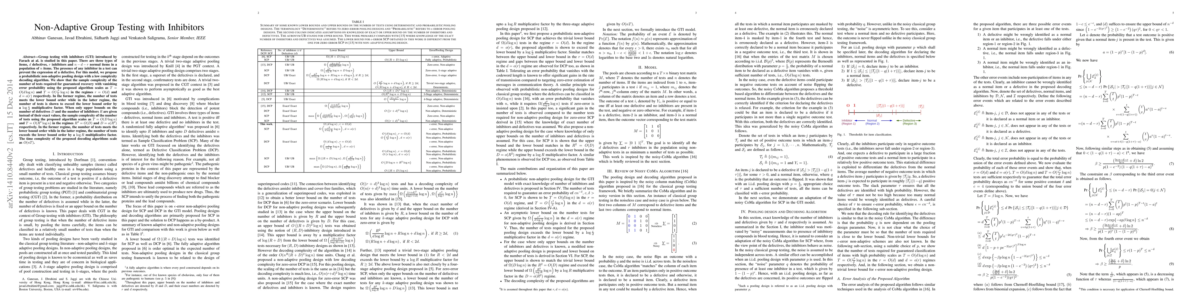 The paper explores a probabilistic non-adaptive pooling design for group testing with inhibitors, showing that the sample complexity of tests required to guarantee recovery scales as $O(d ext{ or } R^2 ext{ log n})$ in different regimes.