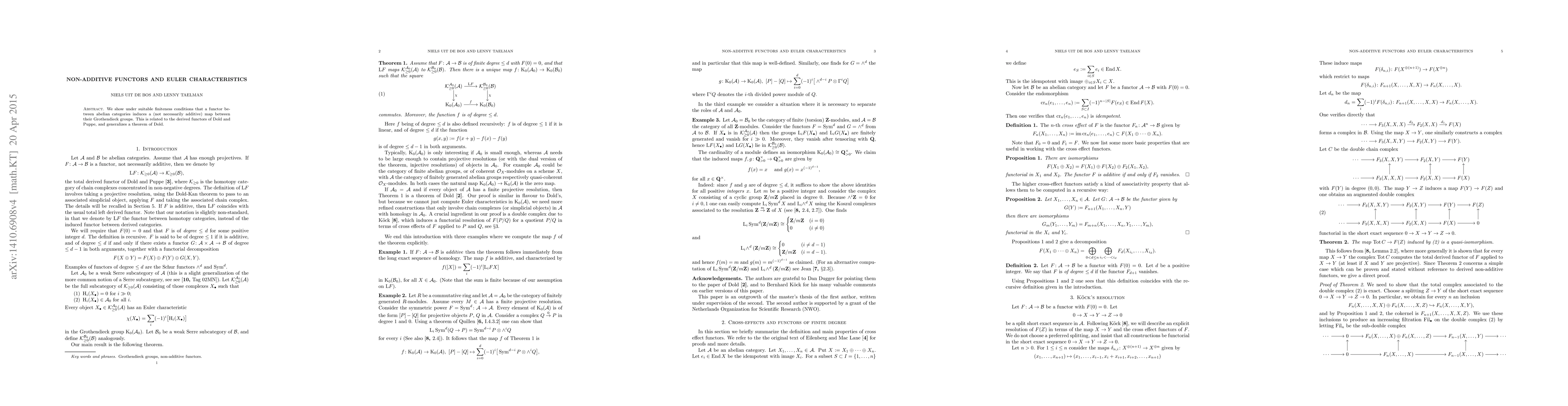 Summary: The paper demonstrates that a functor between abelian categories induces a non-additive map between their Grothendieck groups under finiteness conditions, connecting to Dold-Puppe derived functors and extending Dold's theorem.