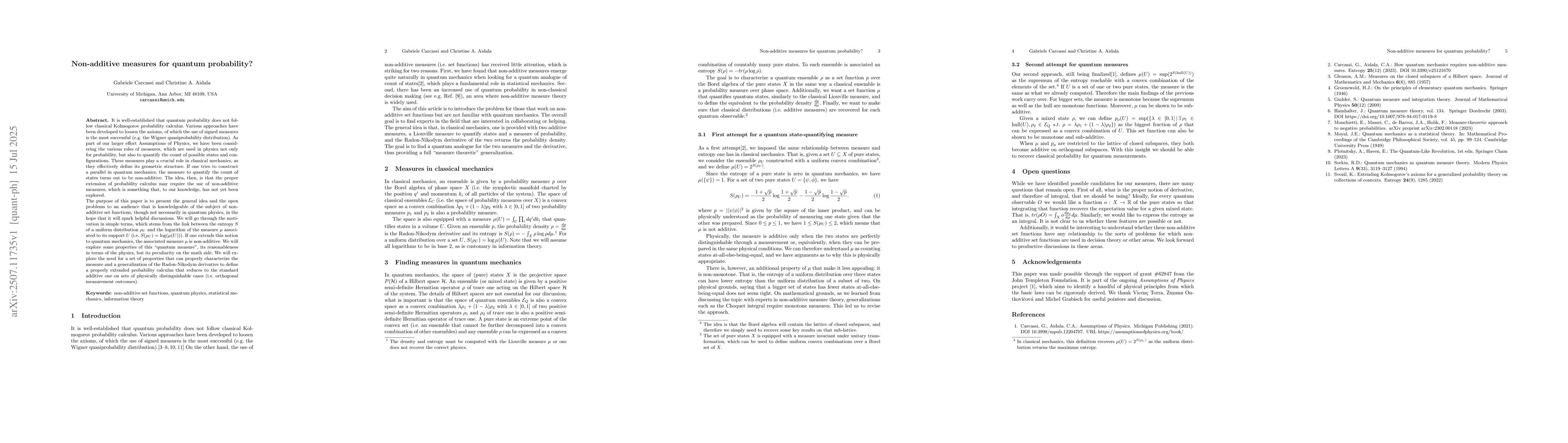 It is well-established that quantum probability does not follow classical Kolmogorov probability calculus. Various approaches have been developed to loosen the axioms, of which the use of signed measures is the most successful (e.g. the Wigner quasiprobability distribution). As part of our larger effort Assumptions of Physics, we have been considering the various roles of measures, which are used in physics not only for probability, but also to quantify the count of possible states and configurations. These measures play a crucial role in classical mechanics, as they effectively define its geometric structure. If one tries to construct a parallel in quantum mechanics, the measure to quantify the count of states turns out to be non-additive. The proper extension of probability calculus may require the use of non-additive measures, which is something that, to our knowledge, has not yet been explored. The purpose of this paper is to present the general idea and the open problems to an audience that is knowledgeable of the subject of non-additive set functions, though not necessarily in quantum physics, in the hope that it will spark helpful discussions. We go through the motivation in simple terms, which stems from the link between the entropy of a uniform distribution and the logarithm of the measure associated to its support. If one extends this notion to quantum mechanics, the associated measure is non-additive. We will explore some properties of this "quantum measure", its reasonableness in terms of the physics, but its peculiarity on the math side. We will explore the need for a set of properties that can properly characterize the measure and a generalization of the Radon-Nikodym derivative to define a properly extended probability calculus that reduces to the standard additive one on sets of physically distinguishable cases (i.e. orthogonal measurement outcomes).