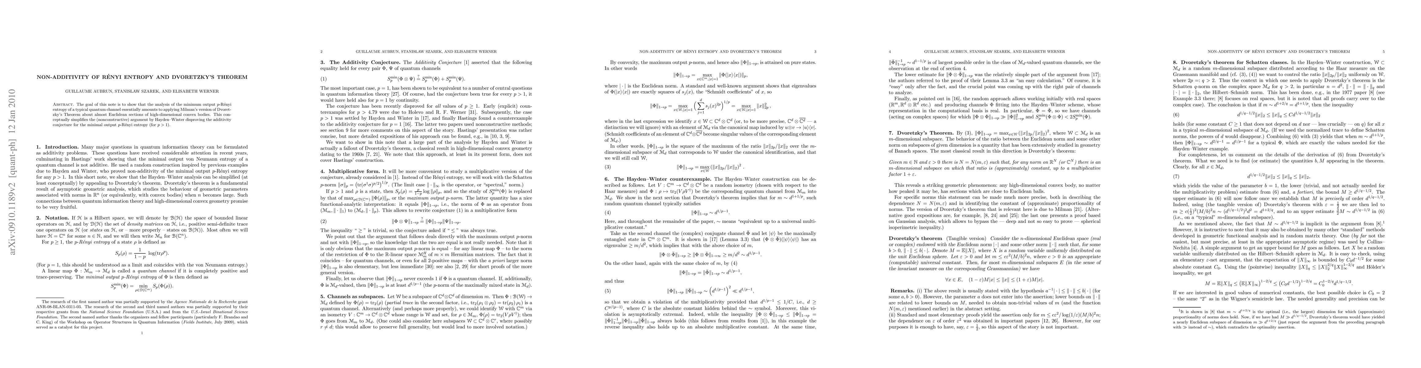 The goal of this note is to show that the analysis of the minimum output p-Renyi entropy of a typical quantum channel essentially amounts to applying Milman's version of Dvoretzky's Theorem about almost Euclidean sections of high-dimensional convex bodies. This conceptually simplifies the (nonconstructive) argument by Hayden-Winter disproving the additivity conjecture for the minimal output p-Renyi entropy (for p>1).