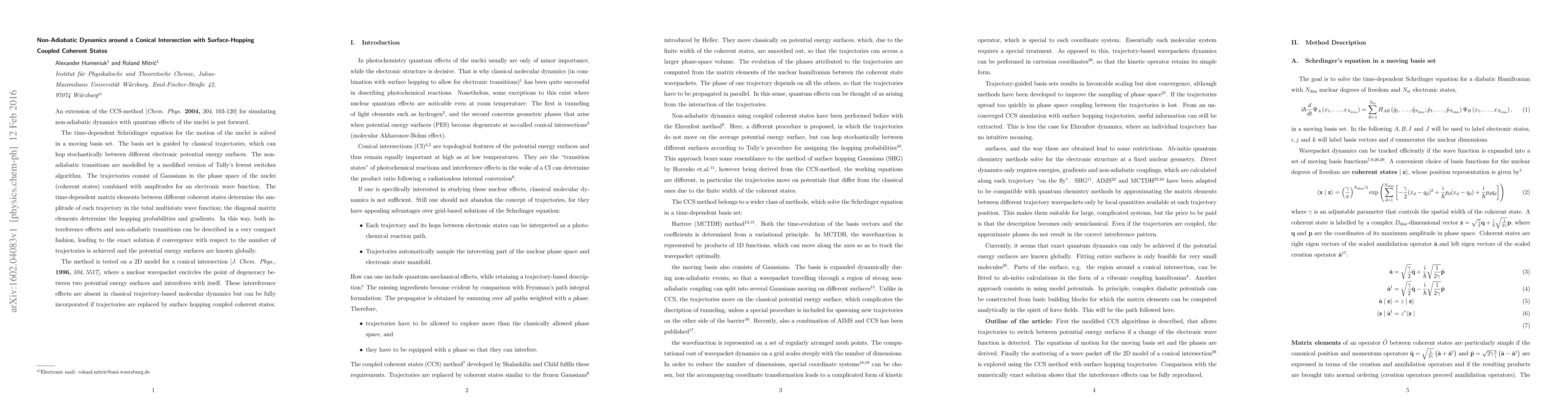 This paper proposes an advanced CCS-method for simulating non-adiabatic dynamics with quantum effects, solving the time-dependent Schrödinger equation in a moving basis set guided by classical trajectories. The method models non-adiabatic transitions and incorporates interference effects, tested on a 2D conical intersection model.