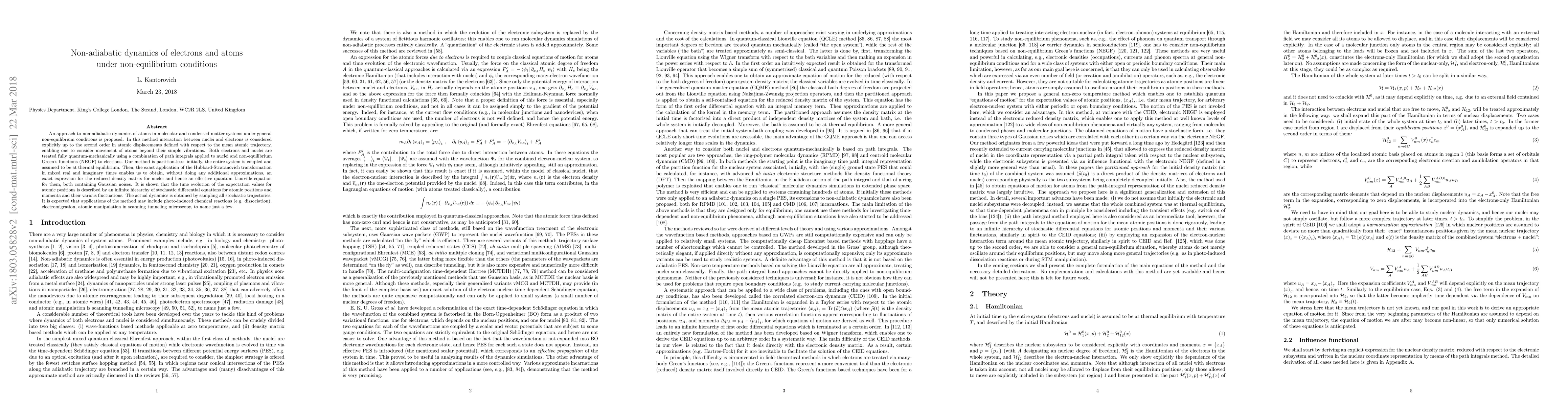 This paper proposes a method for non-adiabatic dynamics of atoms and electrons in non-equilibrium conditions, treating both nuclei and electrons quantum-mechanically. The approach uses path integrals and non-equilibrium Green's functions, leading to stochastic differential equations for atomic dynamics, with potential applications in photo-induced reactions and atomic manipulation.