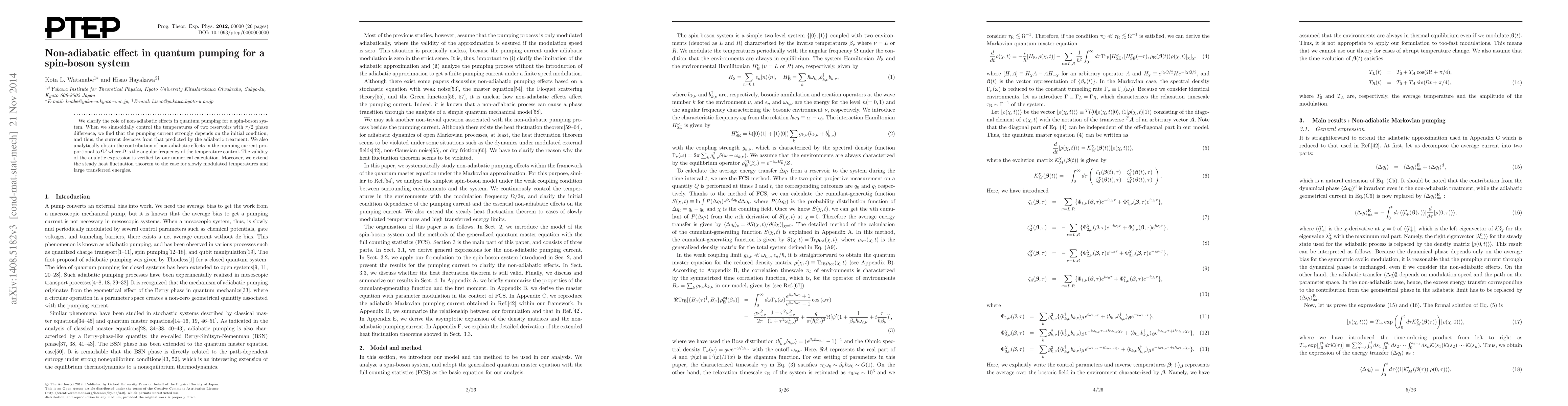 This paper investigates non-adiabatic effects in quantum pumping for a spin-boson system, revealing that pumping current strongly depends on initial conditions, deviating from adiabatic predictions. The study analytically derives a non-adiabatic contribution proportional to \(\Omega^3\), validated by numerical calculations, and extends the steady heat fluctuation theorem for modulated temperatures.