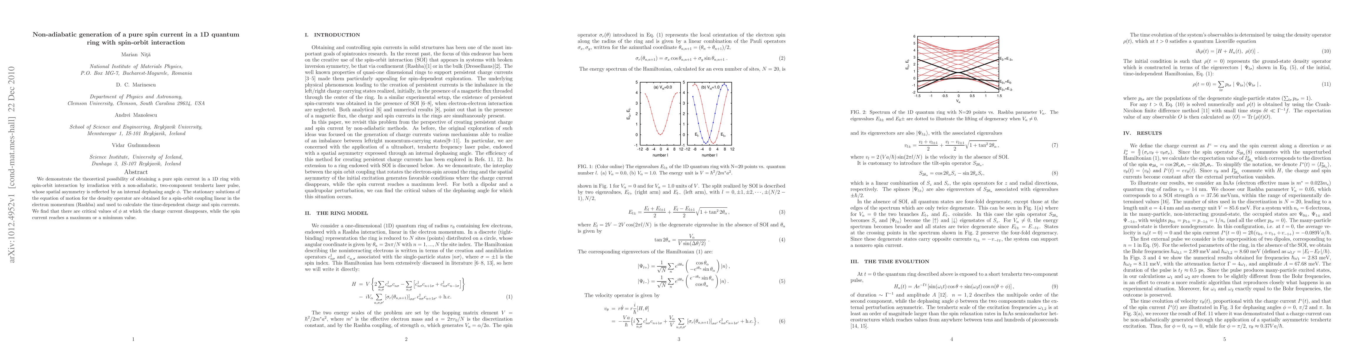 This paper explores the generation of a pure spin current in a 1D quantum ring with spin-orbit interaction via a non-adiabatic terahertz laser pulse. Critical values of the internal dephasing angle $\phi$ are identified where charge current vanishes while spin current peaks or troughs.
