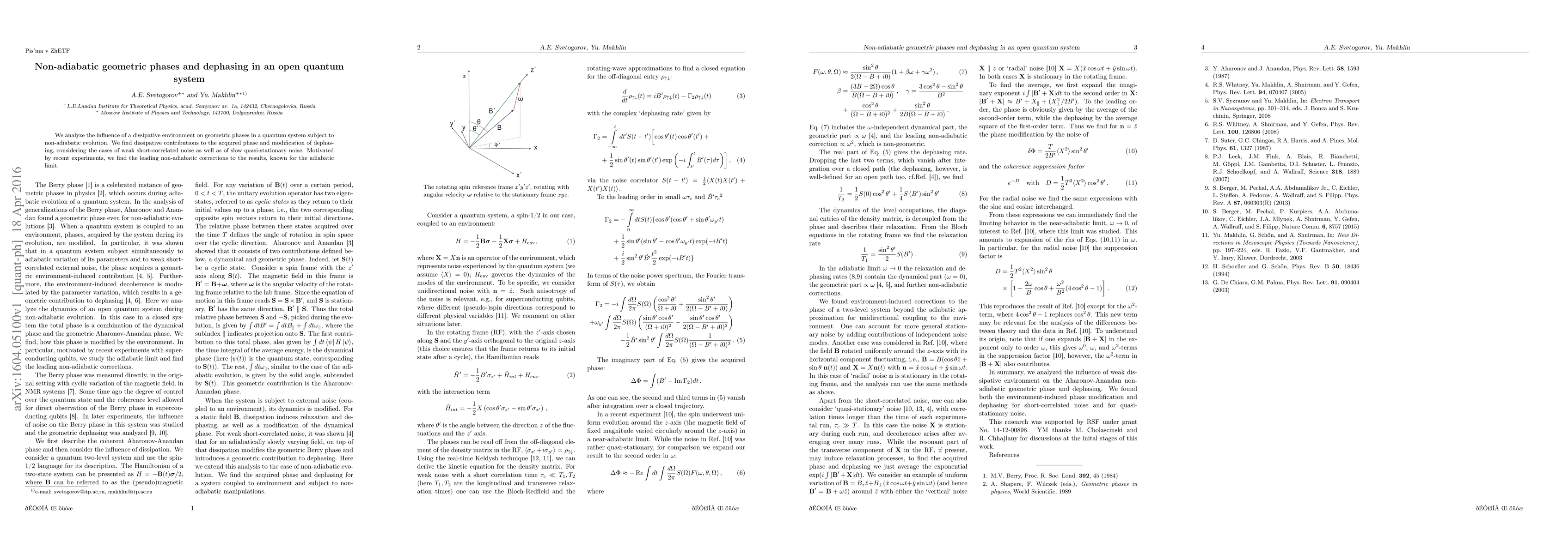 We analyze the influence of a dissipative environment on geometric phases in a quantum system subject to non-adiabatic evolution. We find dissipative contributions to the acquired phase and modification of dephasing, considering the cases of weak short-correlated noise as well as of slow quasi-stationary noise. Motivated by recent experiments, we find the leading non-adiabatic corrections to the results, known for the adiabatic limit.