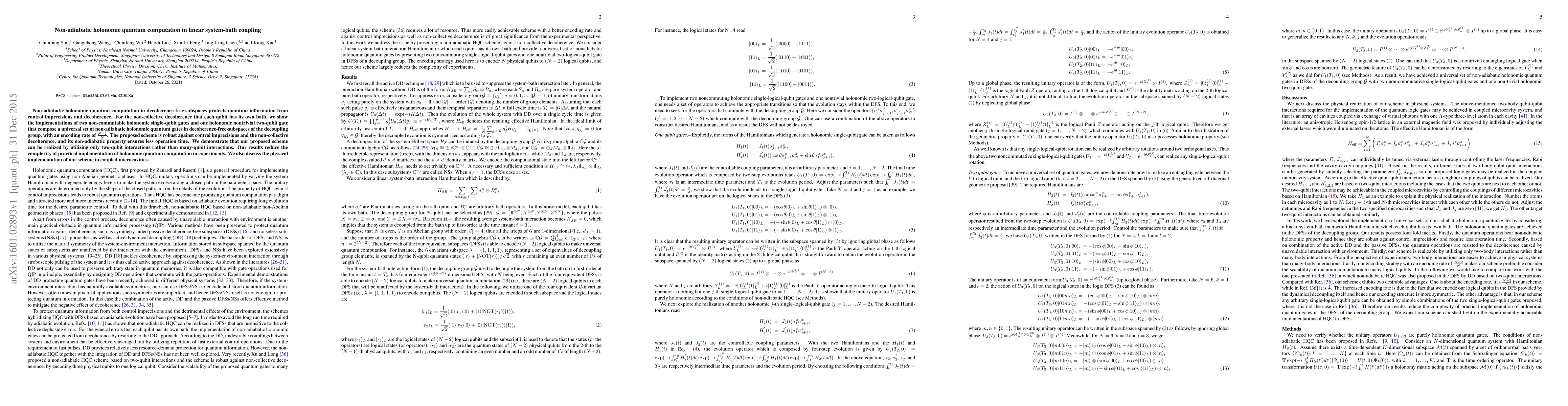 Non-adiabatic holonomic quantum computation in decoherence-free subspaces protects quantum information from control imprecisions and decoherence. For the non-collective decoherence that each qubit has its own bath, we show the implementations of two non-commutable holonomic single-qubit gates and one holonomic nontrivial two-qubit gate that compose a universal set of non-adiabatic holonomic quantum gates in decoherence-free-subspaces of the decoupling group, with an encoding rate of $\frac{N-2}{N}$. The proposed scheme is robust against control imprecisions and the non-collective decoherence, and its non-adiabatic property ensures less operation time. We demonstrate that our proposed scheme can be realized by utilizing only two-qubit interactions rather than many-qubit interactions. Our results reduce the complexity of practical implementation of holonomic quantum computation in experiments. We also discuss the physical implementation of our scheme in coupled microcavities.