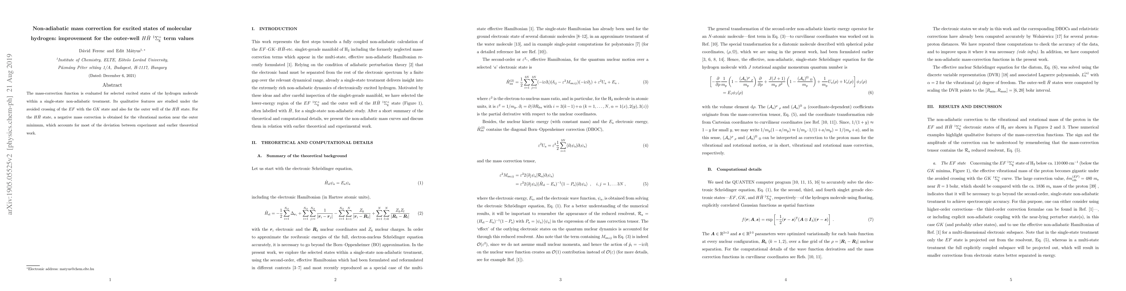 The mass-correction function is evaluated for selected excited states of the hydrogen molecule within a single-state non-adiabatic treatment. Its qualitative features are studied under the avoided crossing of the $EF$ with the $GK$ state and also for the outer well of the $H\bar{H}$ state. For the $H\bar{H}$ state, a negative mass correction is obtained for the vibrational motion near the outer minimum, which accounts for most of the deviation between experiment and earlier theoretical work.