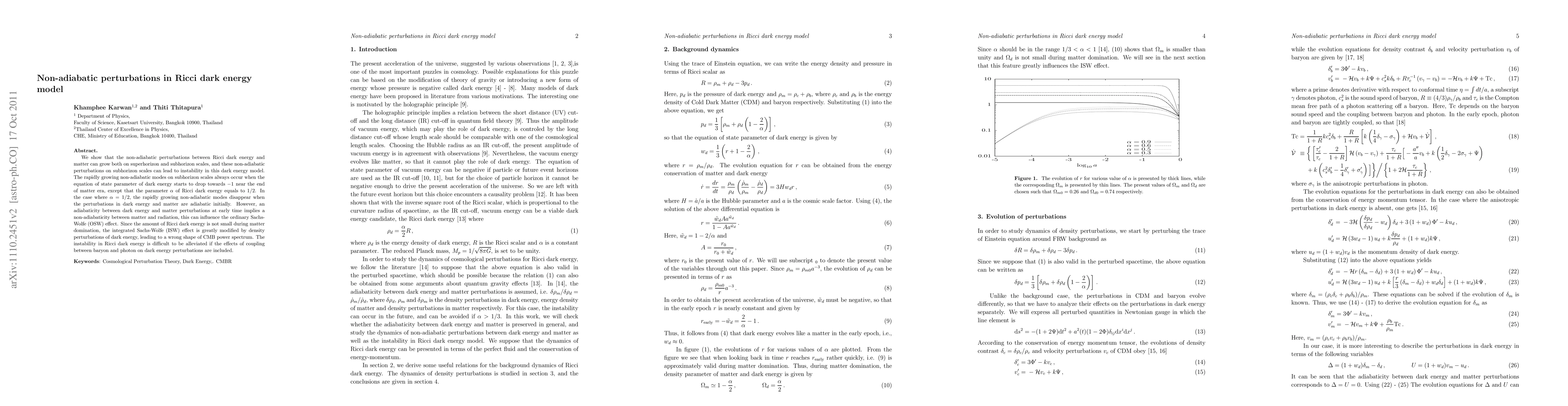 This paper investigates the growth of non-adiabatic perturbations in the Ricci dark energy model, revealing that such perturbations can lead to instability both on superhorizon and subhorizon scales. The study finds that the perturbations grow rapidly when the dark energy equation of state parameter approaches -1, except when the Ricci dark energy parameter α equals 1/2, which mitigates this effect.