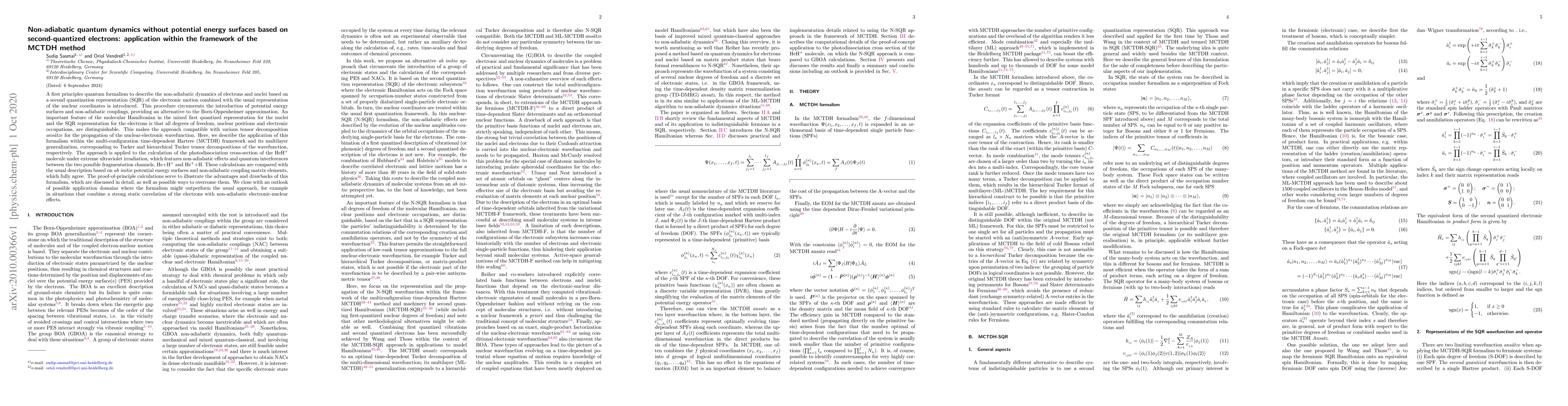 This paper introduces a new quantum formalism for non-adiabatic dynamics that avoids potential energy surfaces and non-adiabatic couplings, instead using second-quantized electrons and a mixed representation for nuclei and electrons. The method is applied within the MCTDH framework to calculate the photodissociation cross-section of HeH$^+$, demonstrating its compatibility with tensor decompositions and comparing results with traditional methods.