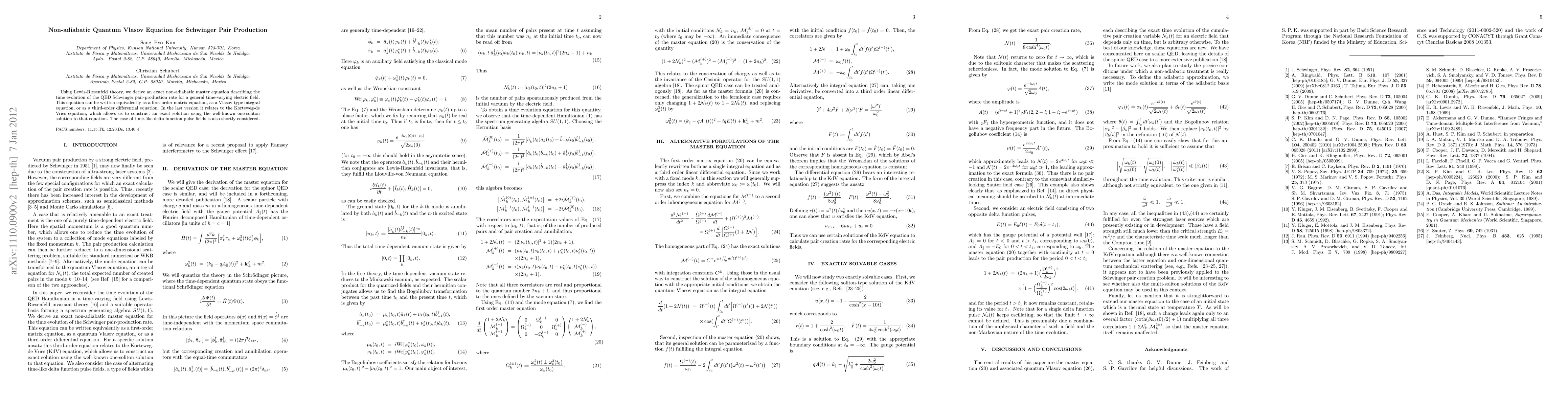 Using Lewis-Riesenfeld theory, we derive an exact non-adiabatic master equation describing the time evolution of the QED Schwinger pair production rate for a general time-varying electric field. This equation can be written equivalently as a first-order matrix equation, as a Vlasov type integral equation, or as a third-order differential equation. In the last version it relates to the KdV equation, which allows us to construct an exact solution using the well-known one-soliton solution to that equation. The case of time-like delta function pulse fields is also shortly considered. We compare with previous approaches to the purely time-dependent field case.