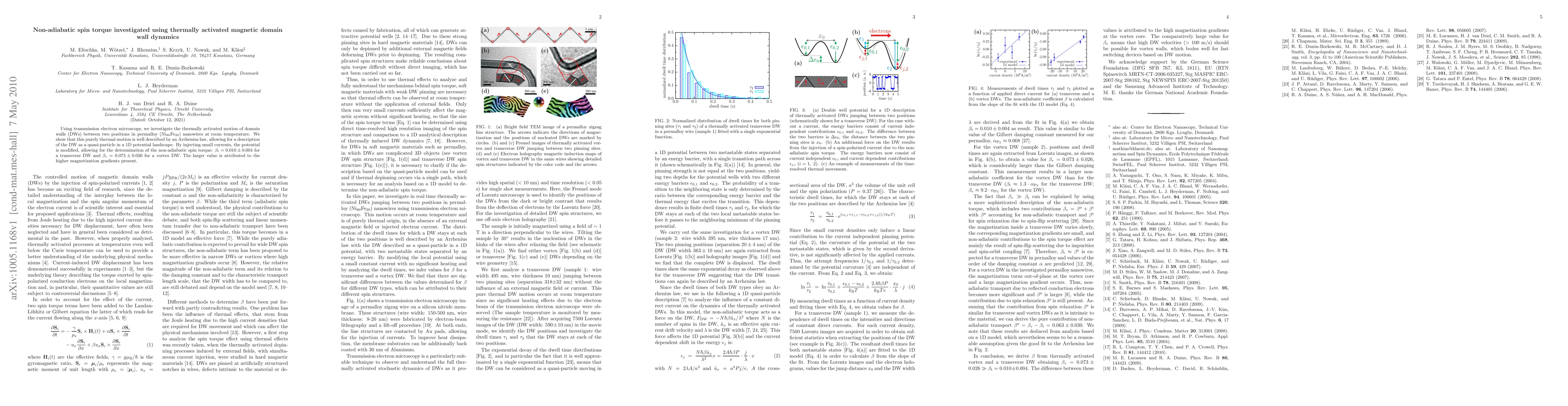 Using transmission electron microscopy, we investigate the thermally activated motion of domain walls (DWs) between two positions in permalloy (Ni80Fe20) nanowires at room temperature. We show that this purely thermal motion is well described by an Arrhenius law, allowing for a description of the DW as a quasi-particle in a 1D potential landscape. By injecting small currents, the potential is modified, allowing for the determination of the non-adiabatic spin torque: the non-adiabatic coefficient is 0.010 +/- 0.004 for a transverse DW and 0.073 +/- 0.026 for a vortex DW. The larger value is attributed to the higher magnetization gradients present.