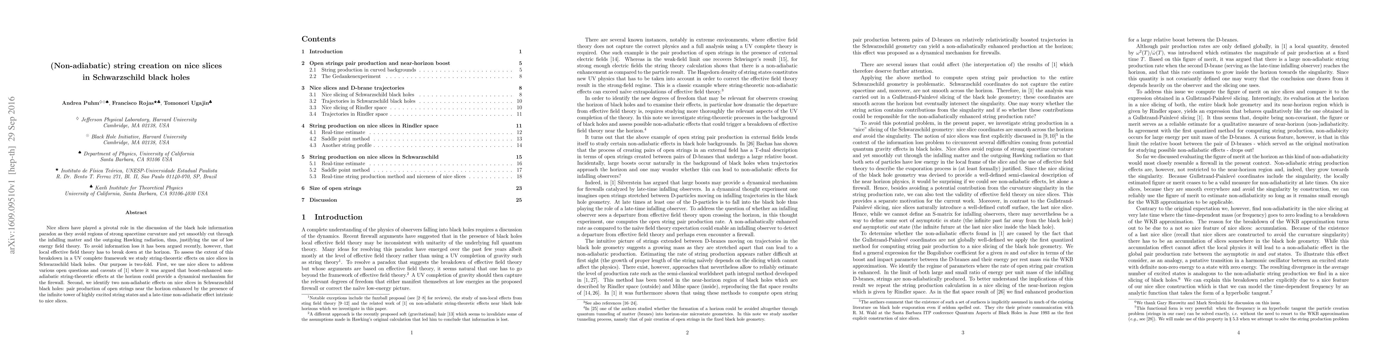 Nice slices have played a pivotal role in the discussion of the black hole information paradox as they avoid regions of strong spacetime curvature and yet smoothly cut through the infalling matter and the outgoing Hawking radiation, thus, justifying the use of low energy field theory. To avoid information loss it has been argued recently, however, that local effective field theory has to break down at the horizon. To assess the extent of this breakdown in a UV complete framework we study string-theoretic effects on nice slices in Schwarzschild black holes. Our purpose is two-fold. First, we use nice slices to address various open questions and caveats of arXiv:1402.1486 where it was argued that boost-enhanced non-adiabatic string-theoretic effects at the horizon could provide a dynamical mechanism for the firewall. Second, we identify two non-adiabatic effects on nice slices in Schwarzschild black holes: pair production of open strings near the horizon enhanced by the presence of the infinite tower of highly excited string states and a late-time non-adiabatic effect intrinsic to nice slices.