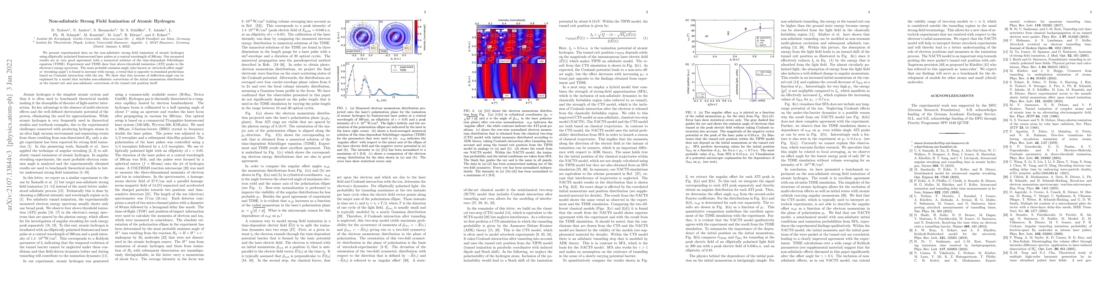 This paper reports experimental data on non-adiabatic strong field ionization of atomic hydrogen using elliptically polarized femtosecond laser pulses, showing four ATI peaks. The observed increase in the emission angle with energy, contrary to Coulomb-based predictions, is explained by a model incorporating non-adiabatic corrections for initial momentum and tunnel exit position.