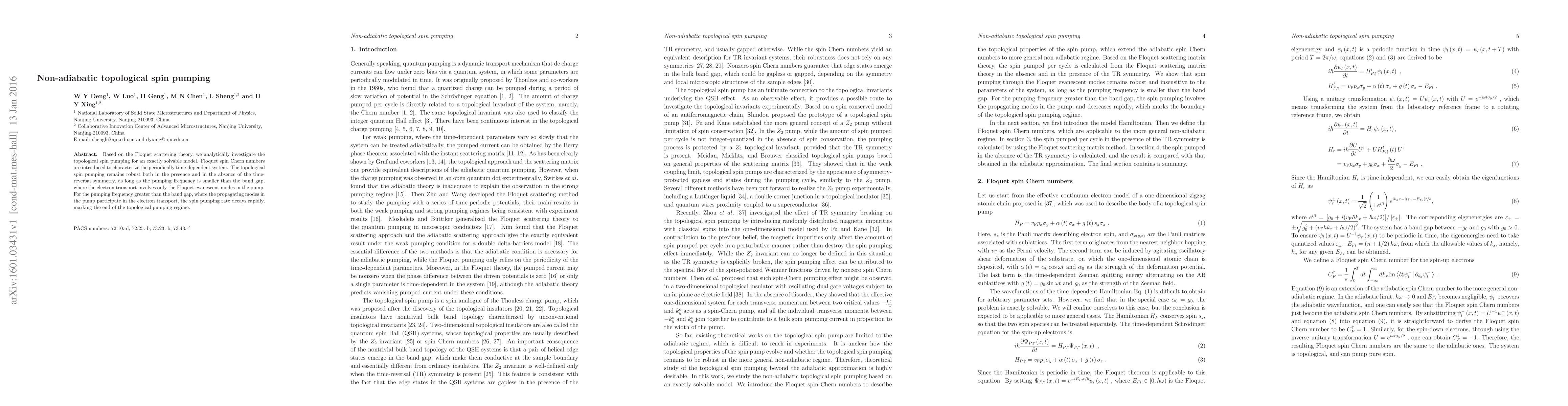 Based on the Floquet scattering theory, we analytically investigate the topological spin pumping for an exactly solvable model. Floquet spin Chern numbers are introduced to characterize the periodically time-dependent system. The topological spin pumping remains robust both in the presence and in the absence of the time-reversal symmetry, as long as the pumping frequency is smaller than the band gap, where the electron transport involves only the Floquet evanescent modes in the pump. For the pumping frequency greater than the band gap, where the propagating modes in the pump participate in the electron transport, the spin pumping rate decays rapidly, marking the end of the topological pumping regime.