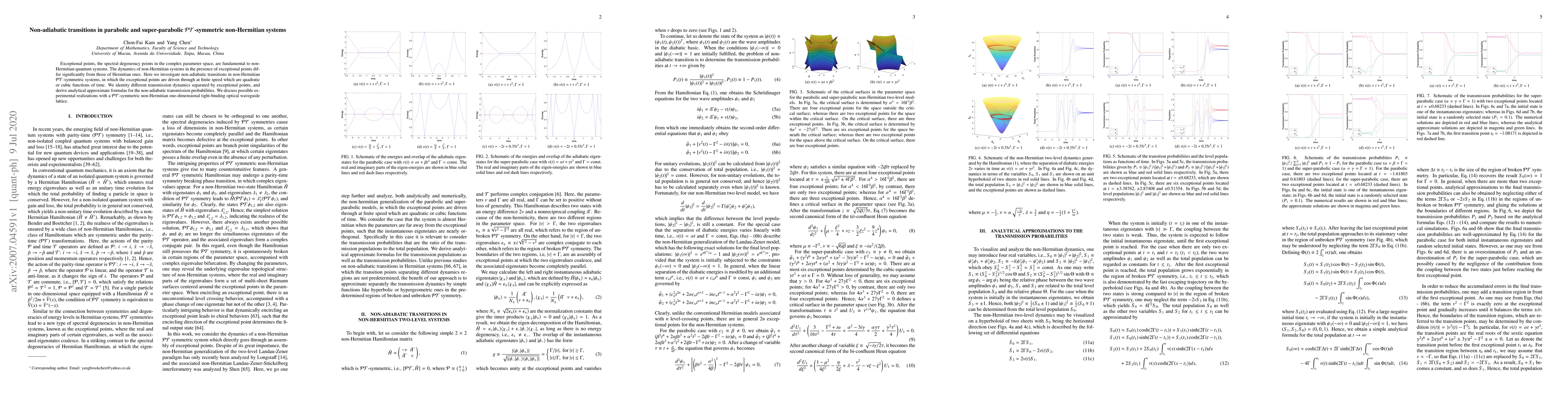 This paper investigates non-adiabatic transitions in $\mathcal{PT}$-symmetric non-Hermitian systems, focusing on the dynamics near exceptional points. Analytical formulas for non-adiabatic transmission probabilities are derived, and potential experimental setups using a one-dimensional optical waveguide lattice are discussed.