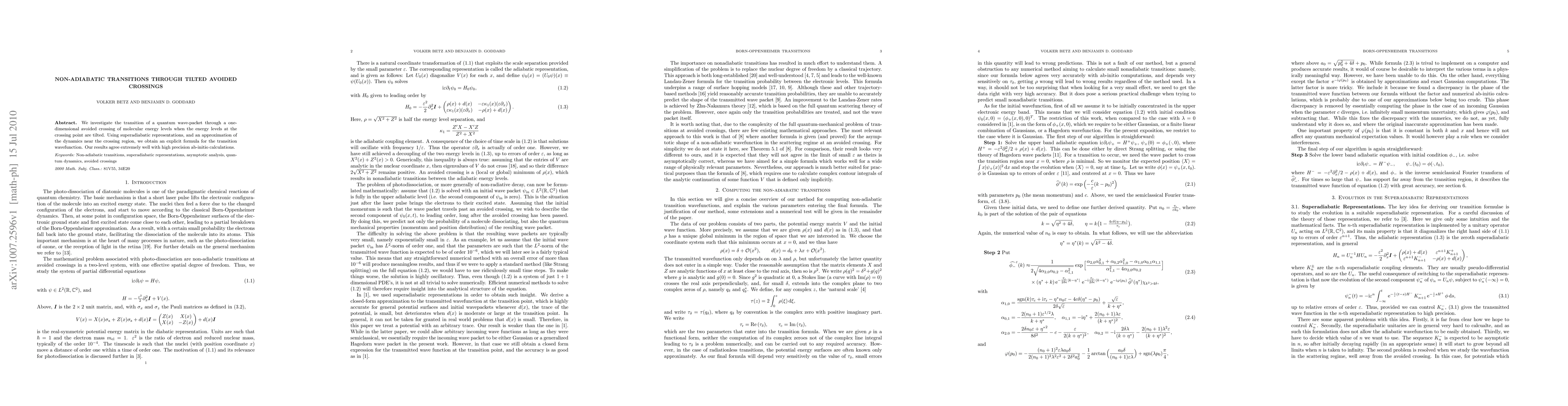 We investigate the transition of a quantum wave-packet through a one-dimensional avoided crossing of molecular energy levels when the energy levels at the crossing point are tilted. Using superadiabatic representations, and an approximation of the dynamics near the crossing region, we obtain an explicit formula for the transition wavefunction. Our results agree extremely well with high precision ab-initio calculations.
