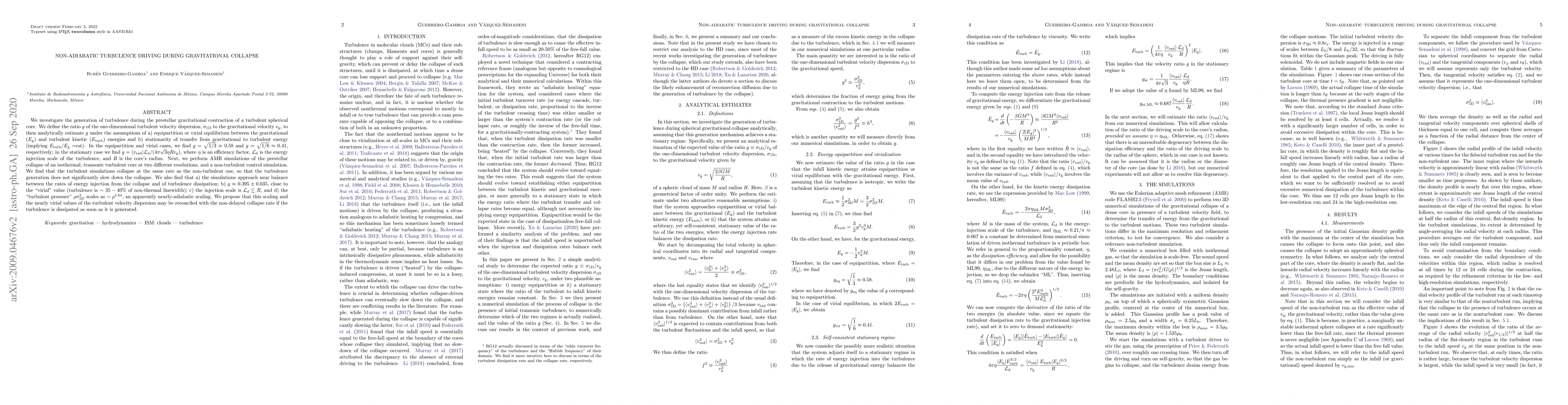 This paper explores turbulence generation during gravitational collapse of a turbulent core, finding that turbulence does not significantly slow down the collapse. Analytical estimates and simulations suggest a nearly virial balance between gravitational and turbulent energies, with turbulence dissipation occurring promptly, maintaining an adiabatic-like scaling.