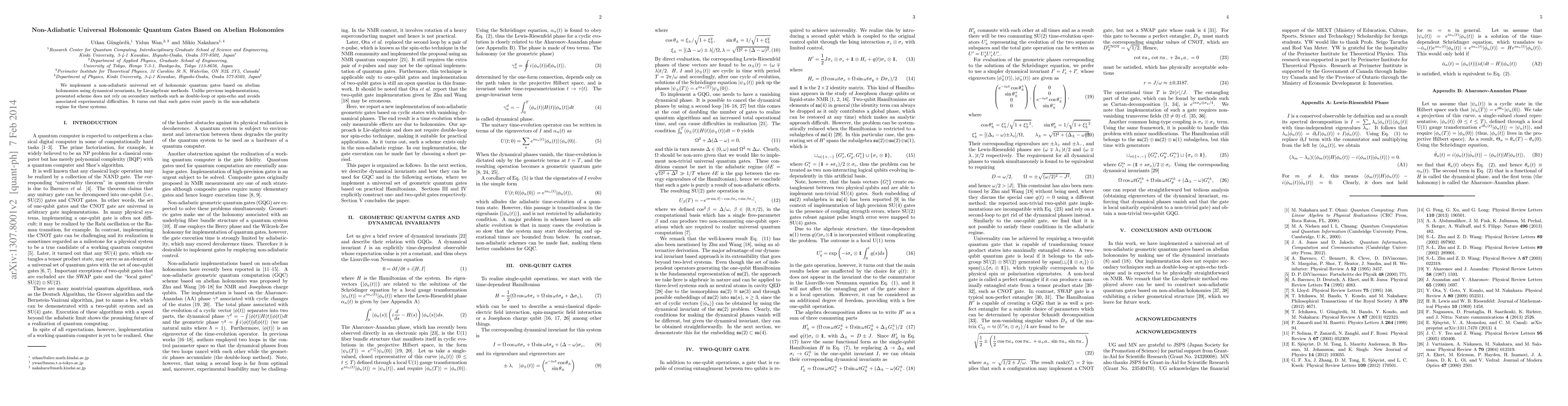 This paper introduces a non-adiabatic universal set of holonomic quantum gates based on abelian holonomies, implemented using dynamical invariants and Lie-algebraic methods, avoiding secondary techniques like double-loop or spin-echo, and thus mitigating associated experimental challenges.