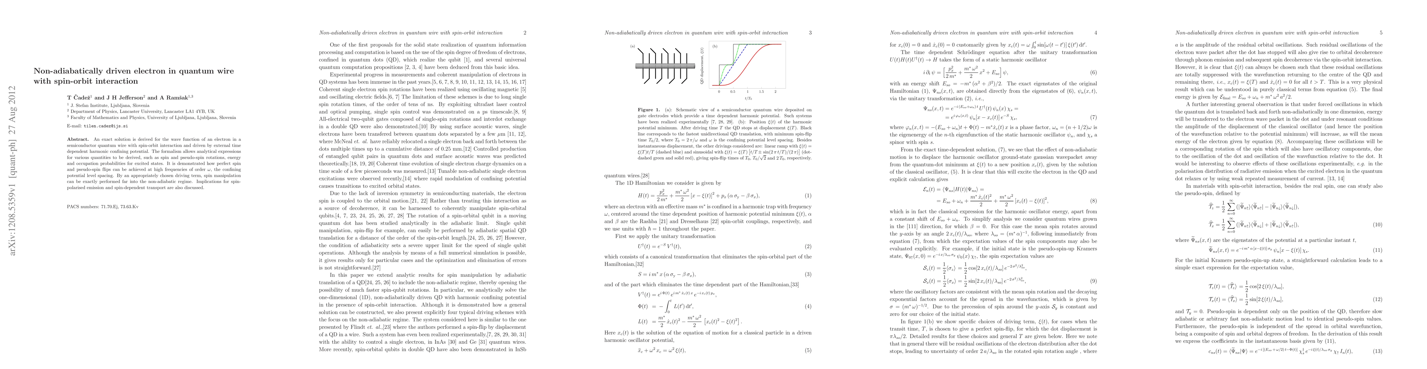This paper derives an exact solution for an electron's wave function in a quantum wire with spin-orbit interaction under a non-adiabatic time-dependent potential. The study reveals analytical expressions for spin and pseudo-spin rotations, and demonstrates perfect spin flips at high frequencies, with implications for spin-polarized emission and transport.