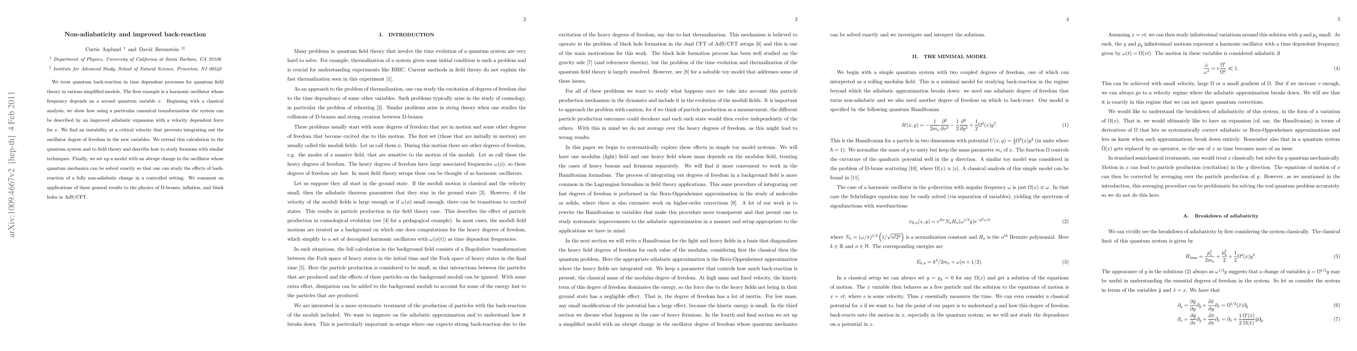 We treat quantum back-reaction in time dependent processes for quantum field theory in various simplified models. The first example is a harmonic oscillator whose frequency depends on a second quantum variable $x$. Beginning with a classical analysis, we show how using a particular canonical transformation the system can be described by an improved adiabatic expansion with a velocity dependent force for $x$. We find an instability at a critical velocity that prevents integrating out the oscillator degree of freedom in the new variables. We extend this calculation to the quantum system and to field theory and describe how to study fermions with similar techniques. Finally, we set up a model with an abrupt change in the oscillator whose quantum mechanics can be solved exactly so that one can study the effects of back-reaction of a fully non-adiabatic change in a controlled setting. We comment on applications of these general results to the physics of D-branes, inflation, and black holes in AdS/CFT.