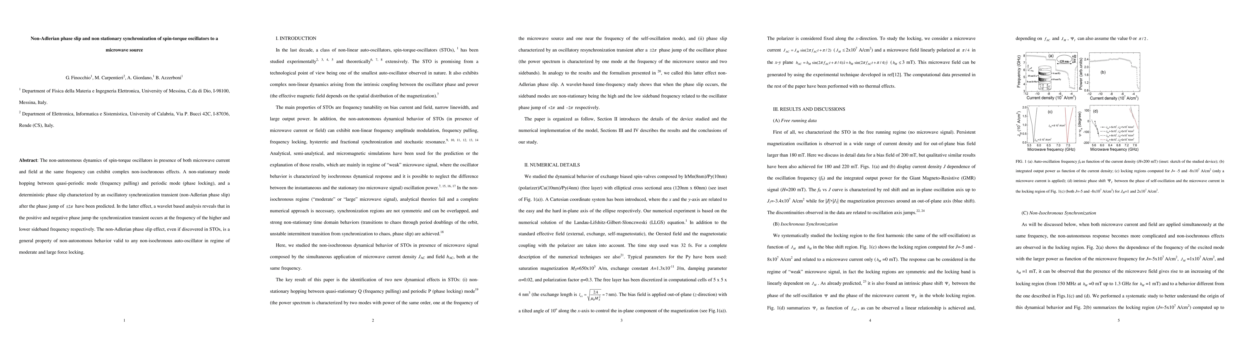 This paper investigates the complex dynamics of spin-torque oscillators under microwave influence, revealing non-stationary synchronization modes and a novel non-Adlerian phase slip effect characterized by oscillatory transients. The study finds that phase slips occur at sideband frequencies, highlighting a general property of non-isochronous auto-oscillators.
