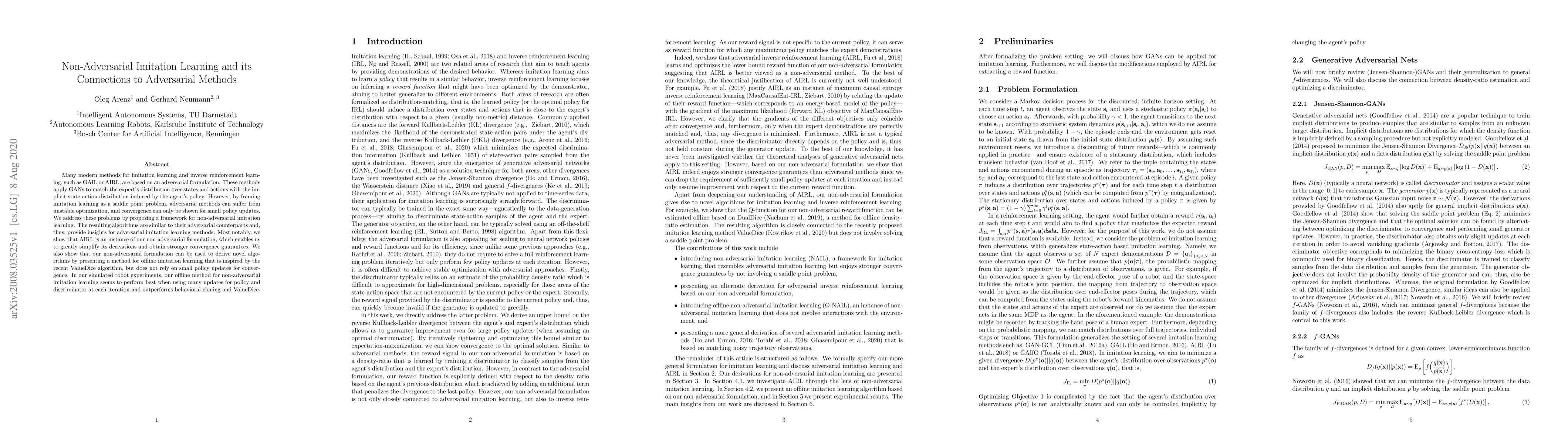 This paper proposes a non-adversarial imitation learning framework that addresses the instability and convergence issues of adversarial methods like GAIL and AIRL. It demonstrates that AIRL can be simplified and improved within this new framework, leading to stronger convergence guarantees and a novel offline imitation learning algorithm that outperforms behavioral cloning and ValueDice in robot experiments.