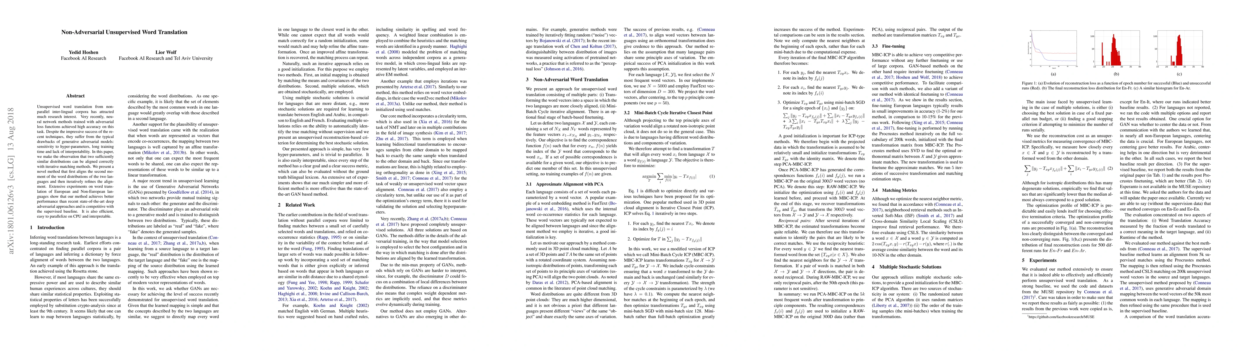 This paper proposes a novel non-adversarial unsupervised method for word translation using iterative matching to align word distributions, achieving better performance and efficiency compared to recent adversarial neural network approaches. The method is interpretable and easy to parallelize on CPU.