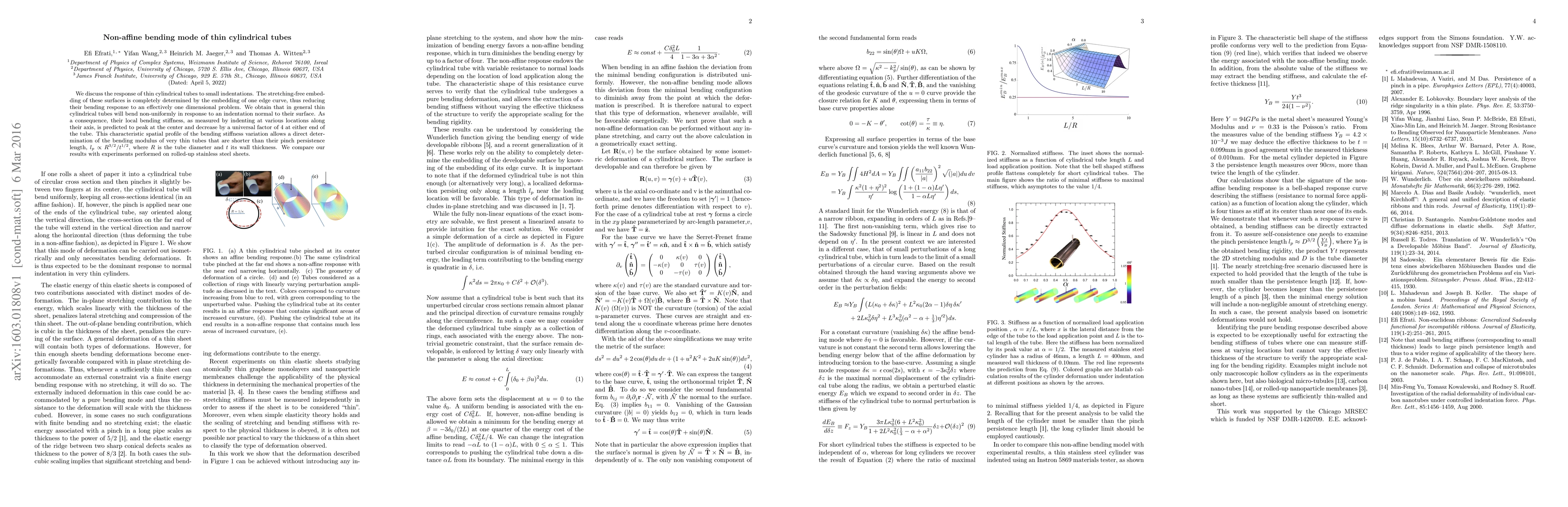The paper examines the non-uniform bending response of thin cylindrical tubes under small indentations, showing that local bending stiffness peaks at the center and decreases to a quarter of that value at the ends. This behavior allows for the determination of the bending modulus in tubes shorter than their pinch persistence length. Experimental results on rolled-up stainless steel sheets corroborate the theoretical findings.