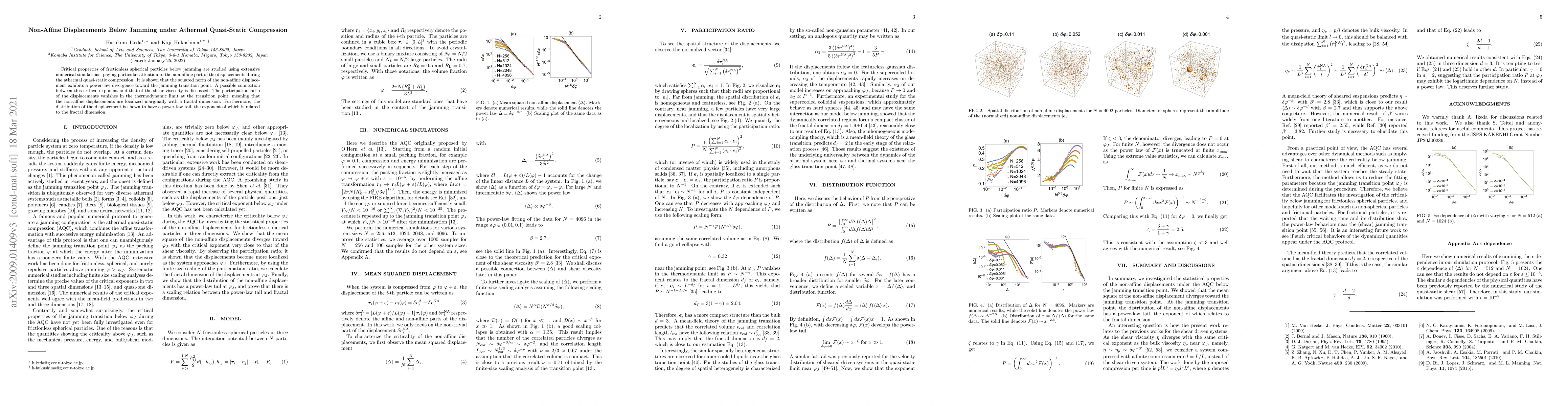 Critical properties of frictionless spherical particles below jamming are studied using extensive numerical simulations, paying particular attention to the non-affine part of the displacements during the athermal quasi-static compression. It is shown that the squared norm of the non-affine displacement exhibits a power-law divergence toward the jamming transition point. A possible connection between this critical exponent and that of the shear viscosity is discussed. The participation ratio of the displacements vanishes in the thermodynamic limit at the transition point, meaning that the non-affine displacements are localized marginally with a fractal dimension. Furthermore, the distribution of the displacement is shown to have a power-law tail, the exponent of which is related to the fractal dimension.