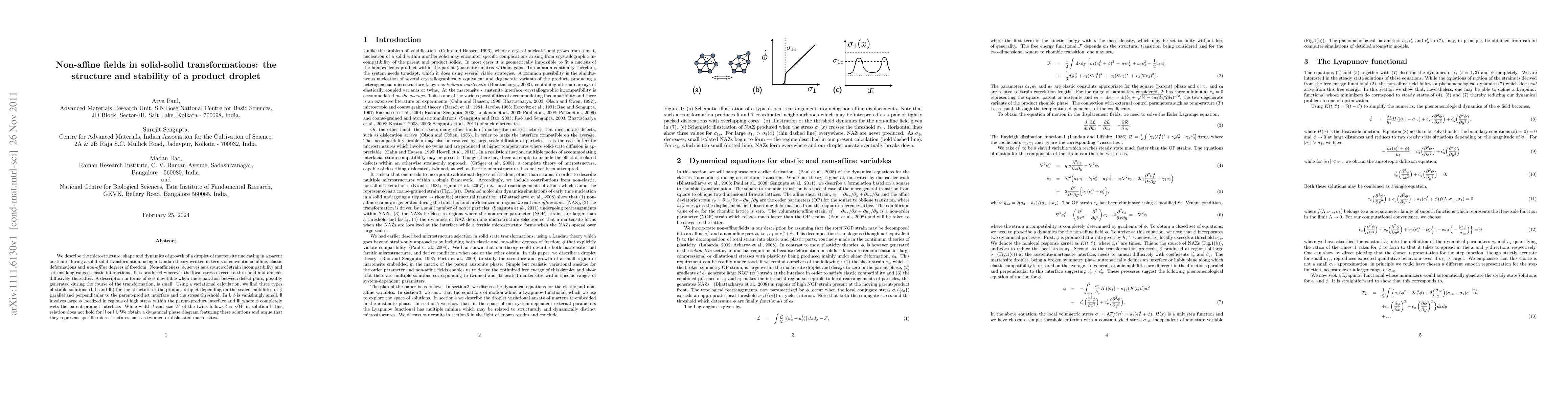 We describe the microstructure, shape and dynamics of growth of a droplet of martensite nucleating in a parent austenite during a solid-solid transformation, using a Landau theory written in terms of conventional affine, elastic deformations and {\em non-affine} degrees of freedom. Non-affineness, $\phi$, serves as a source of strain incompatibility and screens long-ranged elastic interactions. It is produced wherever the local stress exceeds a threshold and anneals diffusively thereafter. A description in terms of $\phi$ is inevitable when the separation between defect pairs, possibly generated during the course of the transformation, is small. Using a variational calculation, we find three types of stable solutions ({\hv I}, {\hv II} and {\hv III}) for the structure of the product droplet depending on the scaled mobilities of $\phi$ parallel and perpendicular to the parent-product interface and the stress threshold. In {\hv I}, $\phi$ is vanishingly small, {\hv II} involves large $\phi$ localized in regions of high stress within the parent-product interface and {\hv III} where $\phi$ completely wets the parent-product interface. While width $l$ and size $W$ of the twins follows $l\propto\sqrt{W}$ in solution {\hv I}, this relation does not hold for {\hv II} or {\hv III}. We obtain a dynamical phase diagram featuring these solutions and argue that they represent specific microstructures such as twinned or dislocated martensites.
