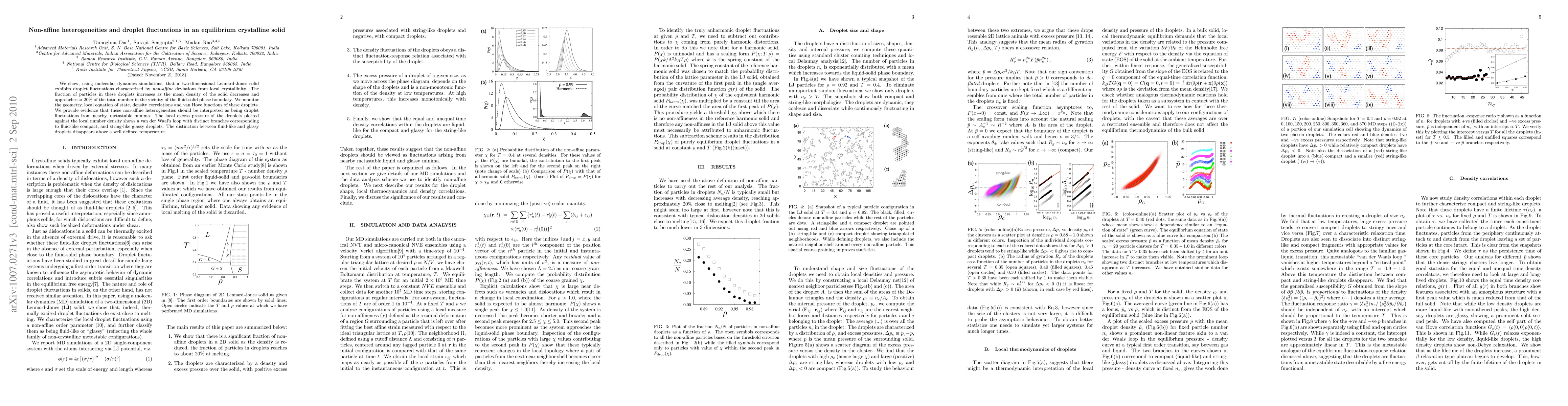This research paper uses molecular dynamics simulations to demonstrate that a two-dimensional Lennard-Jones solid exhibits droplet fluctuations with non-affine deviations from local crystallinity, especially near the fluid-solid phase boundary, where up to 20% of particles form such droplets. The study reveals that these droplets vary in structure, with some being fluid-like and compact, and others glassy and string-like, suggesting they arise from nearby metastable minima.