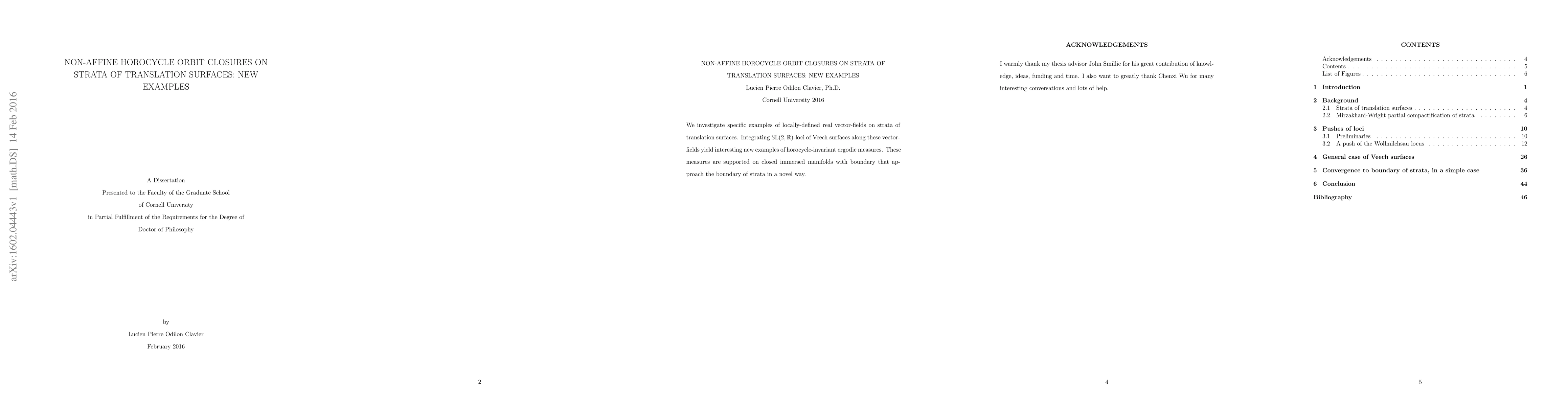 Summary: This paper explores new examples of non-affine horocycle orbit closures on translation surfaces through locally-defined vector fields, yielding novel ergodic measures supported on unique closed immersed manifolds with boundary.
