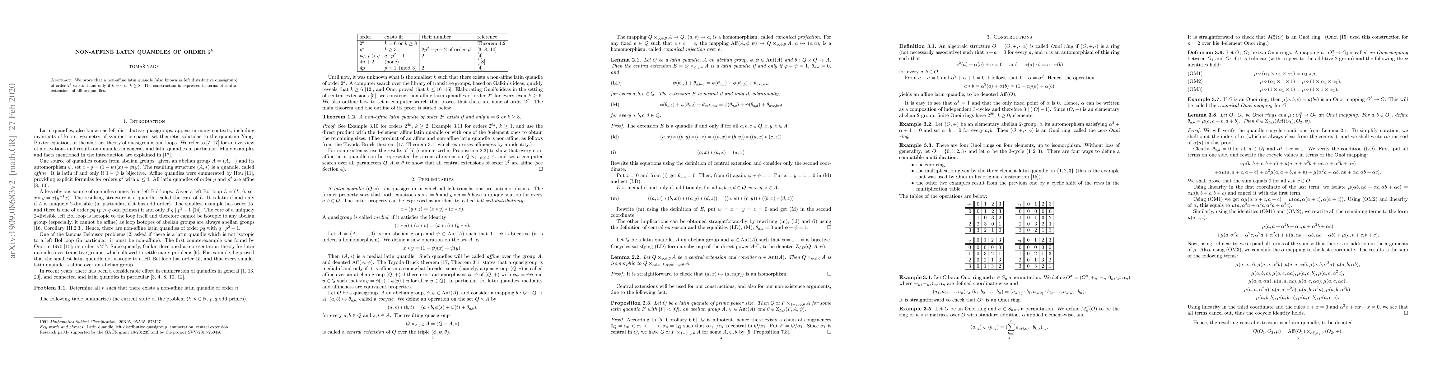 Summary: The paper proves the existence of non-affine latin quandles of order $2^k$ if $k = 6$ or $k \geq 8$, constructed via central extensions of affine quandles. No such quandles exist for other values of $k$.