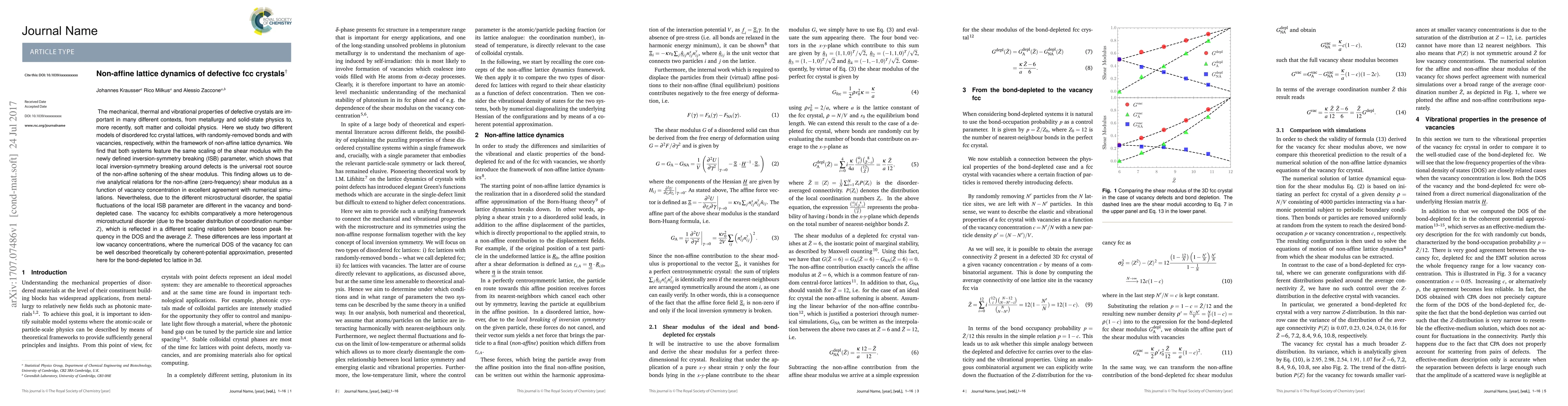 The mechanical, thermal and vibrational properties of defective crystals are important in many different contexts, from metallurgy and solid-state physics to, more recently, soft matter and colloidal physics. Here we study two different models of disordered fcc crystal lattices, with randomly-removed bonds and with vacancies, respectively, within the framework of non-affine lattice dynamics. We find that both systems feature the same scaling of the shear modulus with the newly defined inversion-symmetry breaking (ISB) parameter, which shows that local inversion-symmetry breaking around defects is the universal root source of the non-affine softening of the shear modulus. This finding allows us to derive analytical relations for the non-affine (zero-frequency) shear modulus as a function of vacancy concentration in excellent agreement with numerical simulations. Nevertheless, due to the different microstructural disorder, the spatial fluctuations of the local ISB parameter are different in the vacancy and bond-depleted case. The vacancy fcc exhibits comparatively a more heterogenous microstructural disorder (due to the broader distribution of coordination number $Z$), which is reflected in a different scaling relation between boson peak frequency in the DOS and the average $\bar{Z}$. These differences are less important at low vacancy concentrations, where the numerical DOS of the vacancy fcc can be well described theoretically by coherent-potential approximation, presented here for the bond-depleted fcc lattice in 3d.