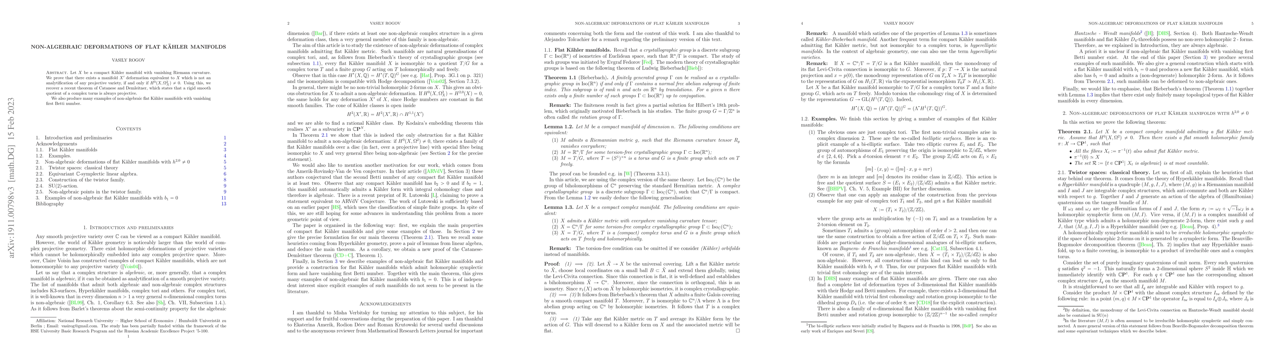 This paper proves the existence of non-algebraic deformations of flat Kähler manifolds with vanishing Riemann curvature, specifically when $H^0(X, \Omega^2) \neq 0$. It also recovers a theorem on the projectivity of rigid smooth quotients of complex tori and provides examples of non-algebraic flat Kähler manifolds.