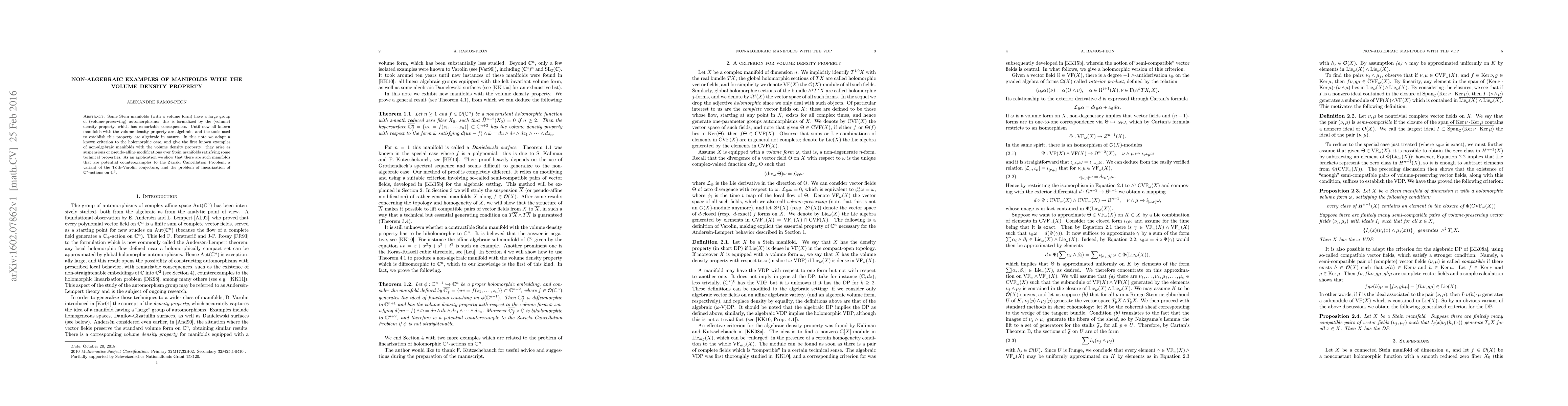 Some Stein manifolds (with a volume form) have a large group of (volume-preserving) automorphisms: this is formalized by the (volume) density property, which has remarkable consequences. Until now all known manifolds with the volume density property are algebraic, and the tools used to establish this property are algebraic in nature. In this note we adapt a known criterion to the holomorphic case, and give the first known examples of non-algebraic manifolds with the volume density property: they arise as suspensions or pseudo-affine modifications over Stein manifolds satisfying some technical properties. As an application we show that there are such manifolds that are potential counterexamples to the Zariski Cancellation Problem, a variant of the Toth-Varolin conjecture, and the problem of linearization of C*-actions on C^3.