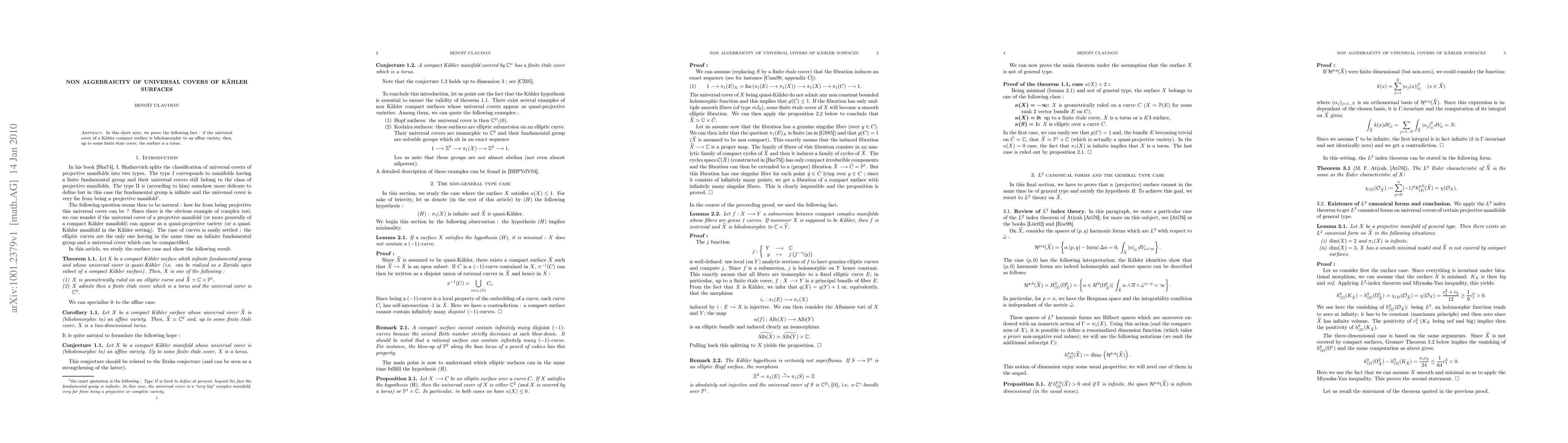 Summary: This note investigates compact Kähler surfaces with quasi-projective universal covers, demonstrating that when the universal cover is affine, the surface is a quotient of a torus, establishing its non-algebraic nature.