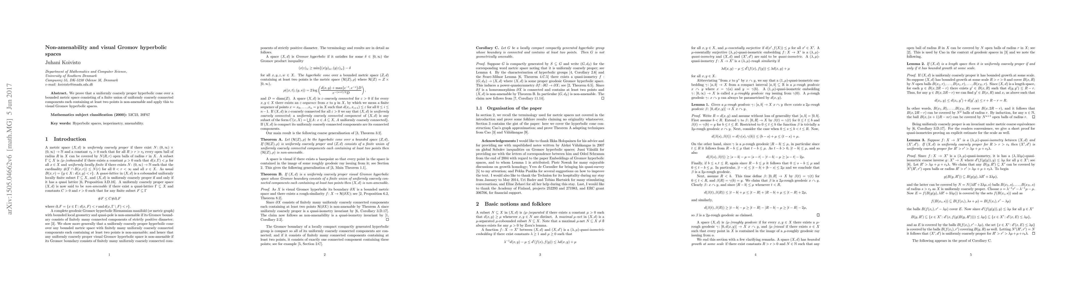 A new class of non-amenable spaces is discovered in hyperbolic geometry, specifically visual Gromov hyperbolic spaces that can be constructed from bounded metric spaces with specific properties. These spaces are shown to be non-amenable, meaning they do not admit a bounded isometry group.