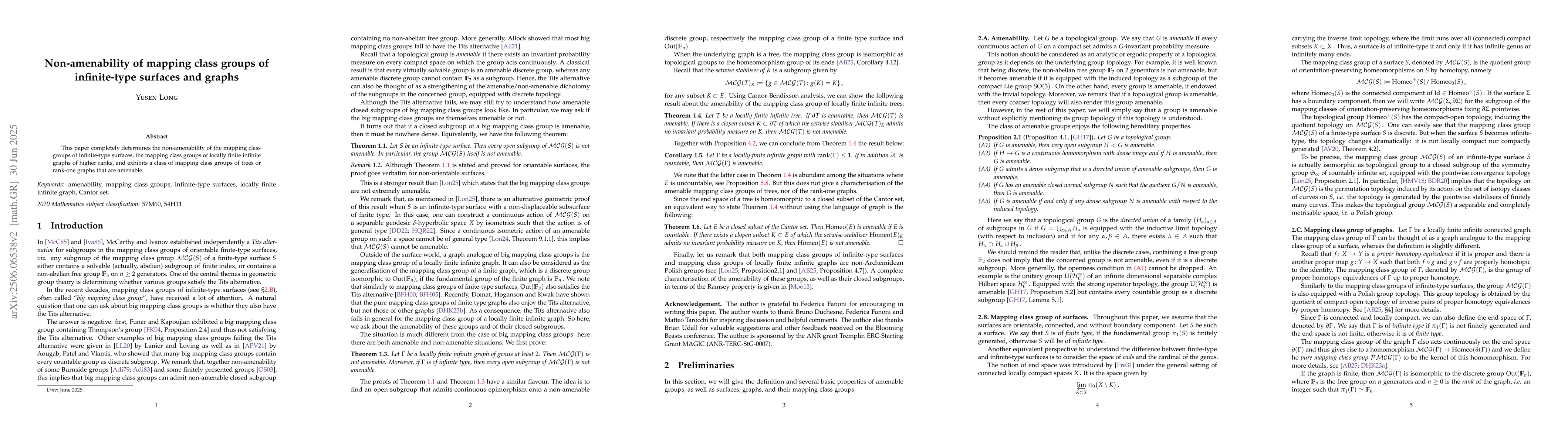 The paper uses topological group theory, focusing on the non-amenability of mapping class groups of infinite-type surfaces and graphs, employing concepts from Cantor-Bendixson analysis and transfinite induction.