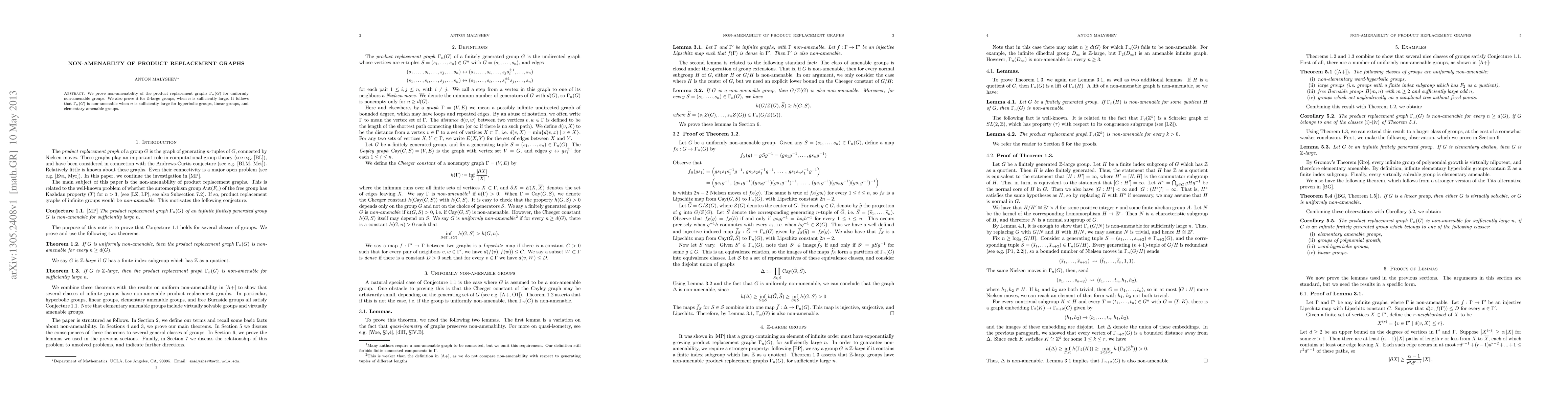 This paper proves the non-amenability of product replacement graphs \Gamma_n(G) for uniformly non-amenable groups and for Z-large groups when n is sufficiently large. It concludes that \Gamma_n(G) is non-amenable for hyperbolic, linear, and elementary amenable groups when n is sufficiently large.
