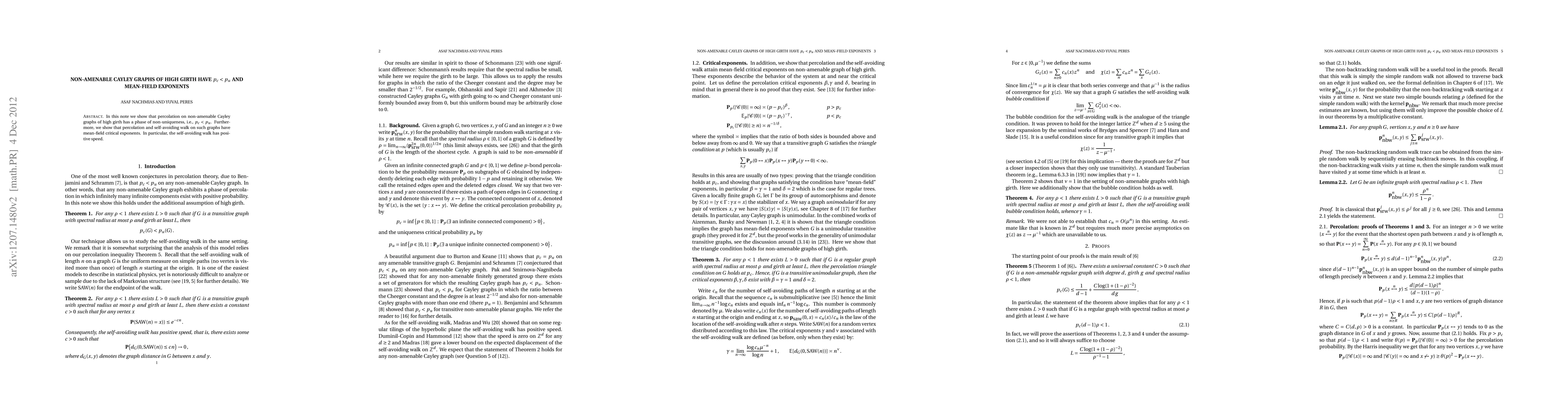 In this note we show that percolation on non-amenable Cayley graphs of high girth has a phase of non-uniqueness, i.e., p_c < p_u. Furthermore, we show that percolation and self-avoiding walk on such graphs have mean-field critical exponents. In particular, the self-avoiding walk has positive speed.