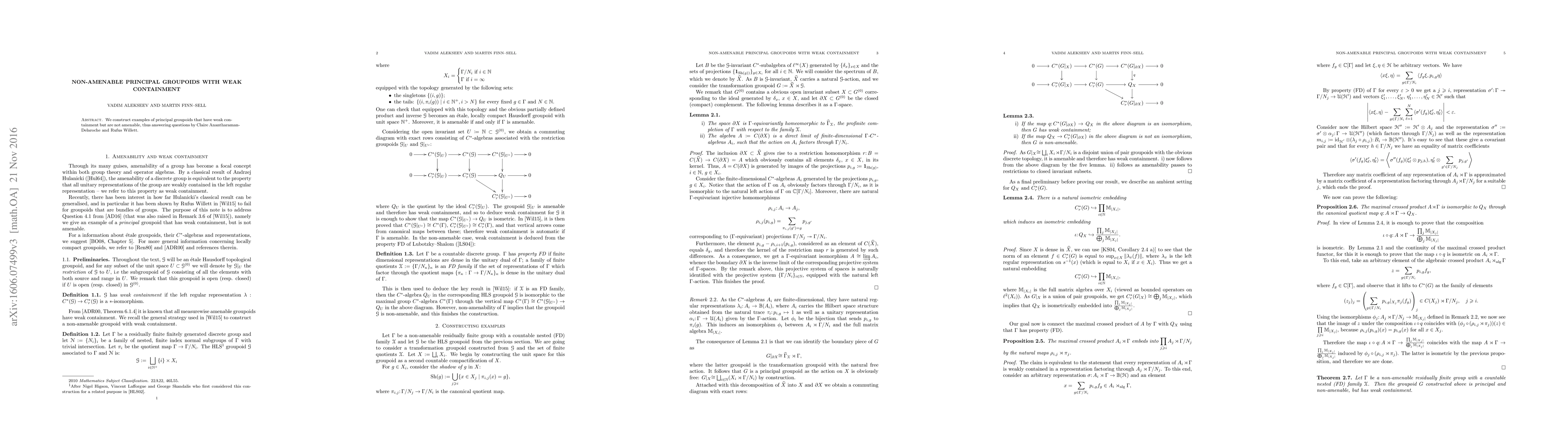 This paper constructs examples of non-amenable principal groupoids that exhibit weak containment, addressing questions posed by Claire Anantharaman-Delaroche and Rufus Willett regarding the relationship between these properties.